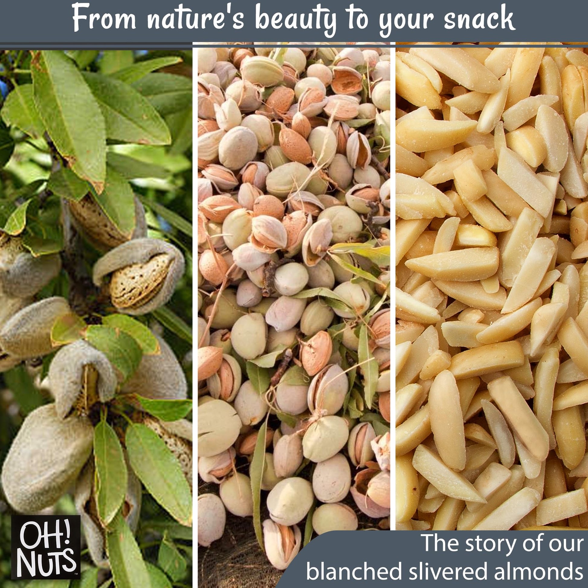 - Q: What is the size of the packaging for these almonds? A: Oh! Nuts Blanched Slivered Almonds are available in a twenty-four ounce bulk bag, providing a convenient size for both snacking and cooking.