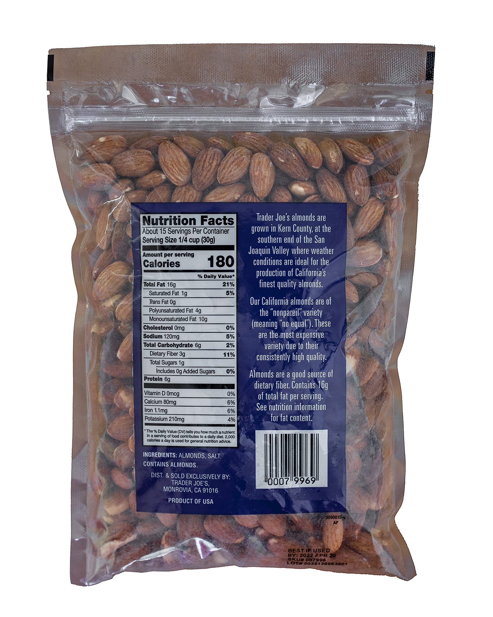 - Q: Is the packaging for Trader Joe's almonds consistent? A: The packaging may differ, as stated on the product, but the quality of the almonds remains consistent regardless of the packaging.