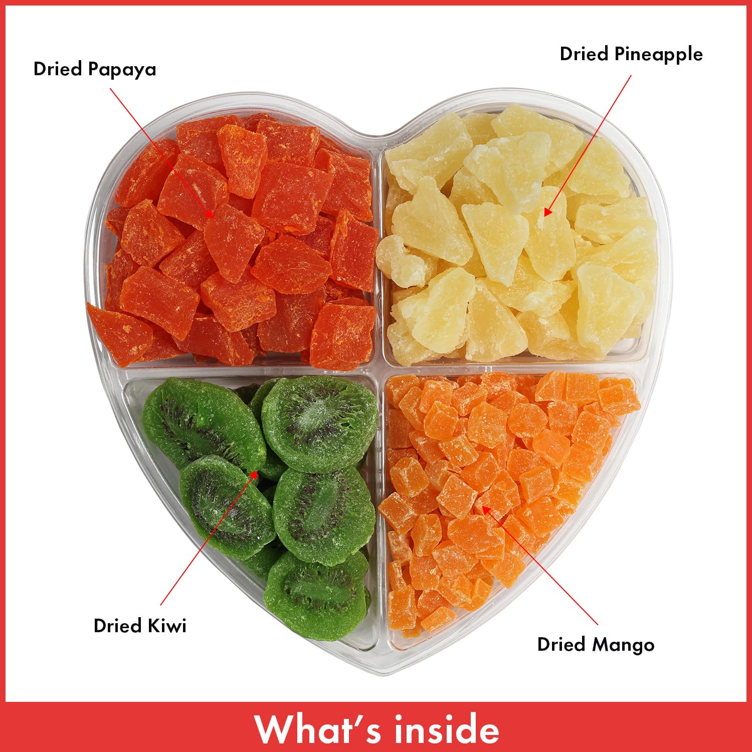 Q: What types of dried fruits are included in the tray?A: The Heart Shaped Dried Fruit Tray includes a delightful assortment of premium dried fruits such as Kiwi, Mango, Papaya, and Pineapple, catering to a variety of tastes.
