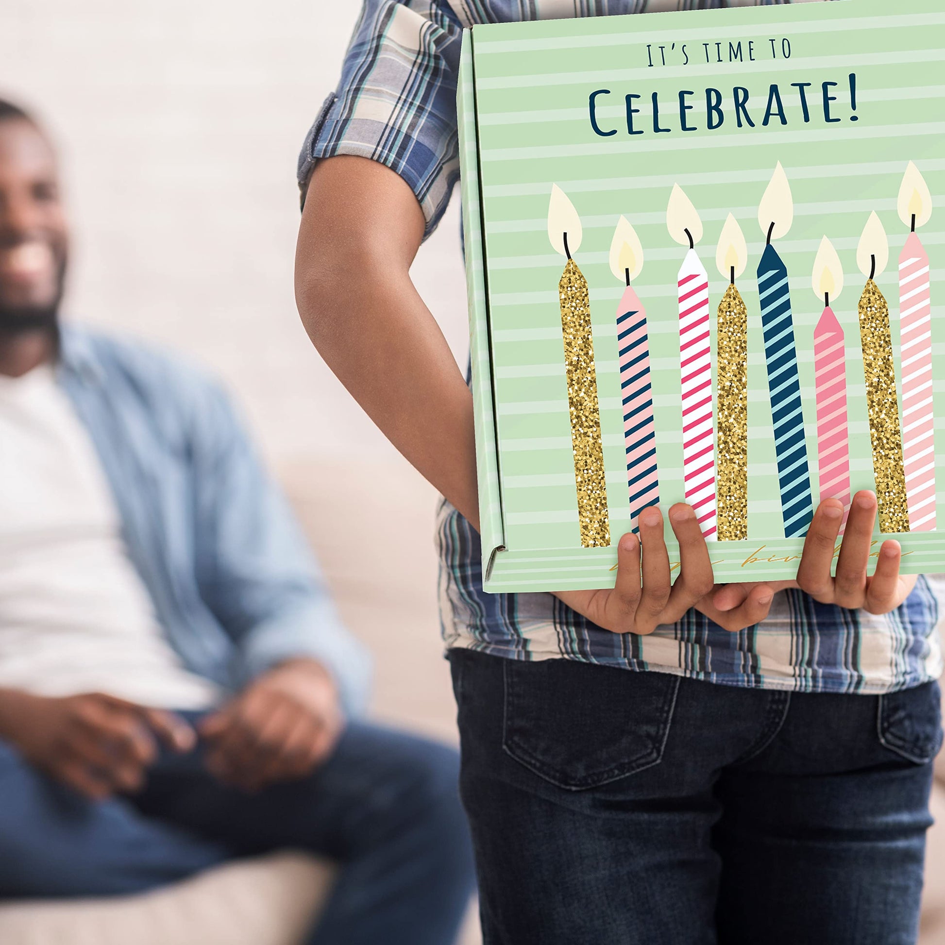 GIFT BOX: Make your loved ones birthday extra special with a beautiful gift box that features a festive birthday design on the outside and a personalized message on the inside. | SWEET: Treat your loved one to our birthday-themed gift box filled with a variety of mouth-watering gourmet delights, including Butter Toffee Mixed Nuts, Roasted Pistachios, Lemon Blueberry cookies, Berry Cherry Trail Mix, Walkers Shortbread Cookies, Toasted Corn Nuggets, and more. | SAVORY: Satisfy your sweet and savory cravings with our perfect balance of snacks, such as Sweet & Savory Snack Mix and Tomato & Olive Crackers. | KOSHER: Enjoy the peace of mind that comes with knowing that all of our gift boxes are Kosher certified, ensuring that they meet the highest standards of quality and purity. | GUARANTEE: Shop with confidence knowing that our products come with a hassle-free 100% satisfaction guarantee. If for any reason you or your recipient are not completely satisfied with your purchase, we will happily replace the order or offer a full refund.