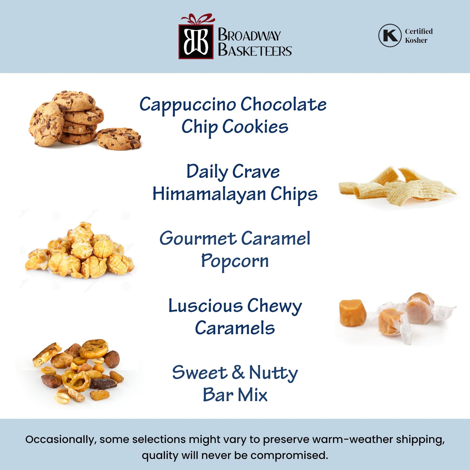 - Q: What is included in the snack assortment of the gift basket? A: The gift basket includes a delightful mix of sweet and savory treats, such as chocolate chip cookies, gourmet caramel popcorn, creme brulee trail mix, chocolate pecan caramels, and Himalayan chips, totaling 2 lbs of delicious snacks.
