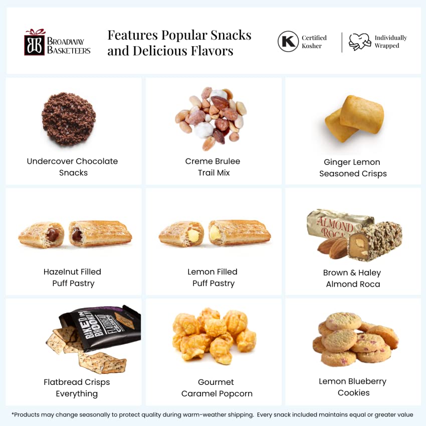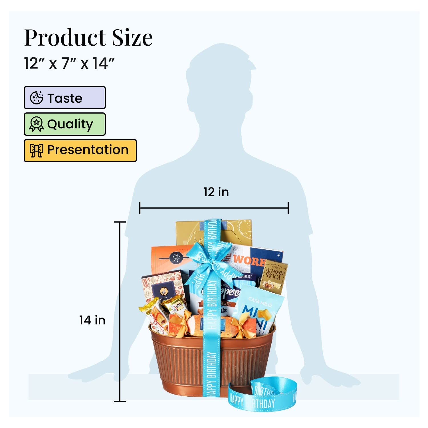 - Q: What types of snacks are included in the Broadway Basketeers Happy Birthday Gift Basket? A: The Broadway Basketeers Happy Birthday Gift Basket includes a delicious assortment of snacks such as chocolate-covered treats, almond roca butter crunch, peanut butter pretzel nuggets, puff pastry, gourmet caramel corn, cookies, and more, ensuring a perfect blend of sweet and savory delights.