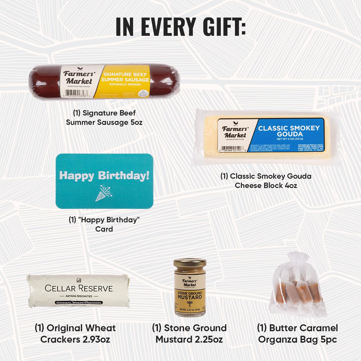 - Q: What ingredients are included in the Farmers Market Gift Basket? A: The Farmers Market Gift Basket includes Traditional Beef Summer Sausage, Vermont Extra Sharp Cheddar, Country Cream Crackers, Whole Grain Mustard, and a 'Happy Birthday' card.