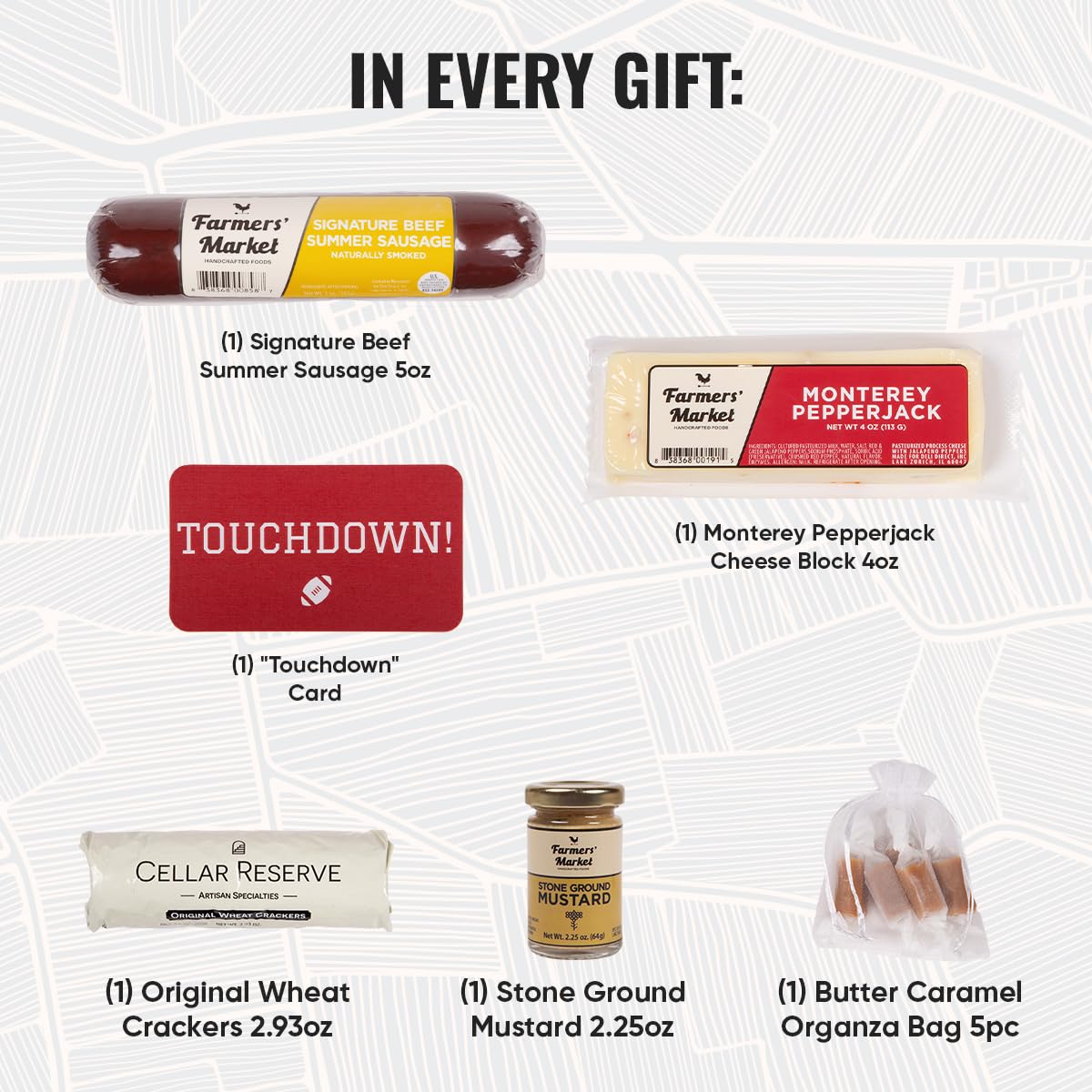 The Farmers Market Charcuterie Sampler includes an assortment of high-quality ingredients, including Traditional Beef Summer Sausage, Vermont Extra Sharp Cheddar, Country Cream ers, and Whole Grain Mustard. Each component is crafted with care, ensuring a flavorful and enjoyable experience for both casual gatherings and special occasions. The included “Tailgates & Touchdowns” card adds a personal touch, making it an ideal gift for sports enthusiasts.