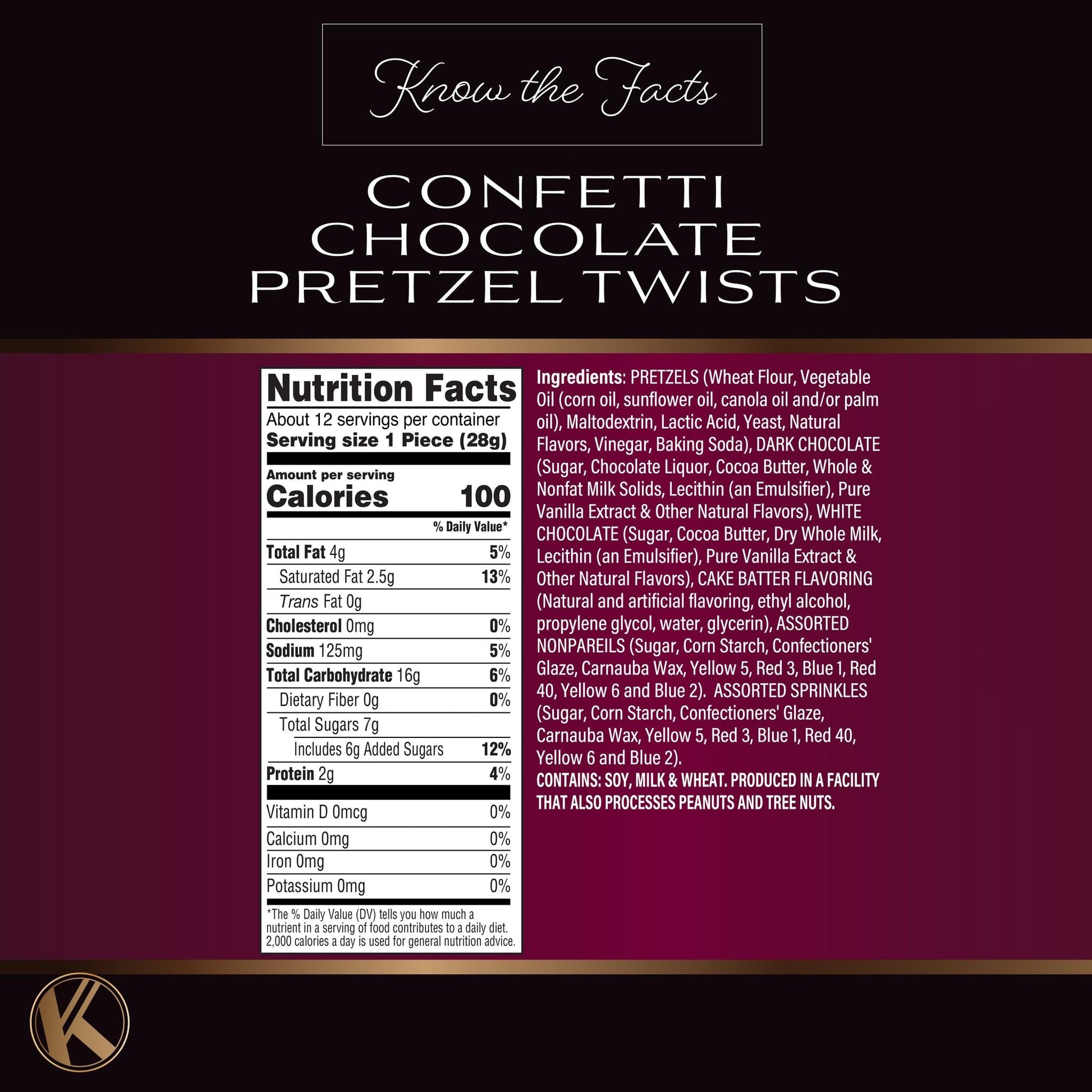 Kremerys Confetti Chocolate Pretzel Twists Combine The Perfect Crunch Of Pretzels With A Rich Chocolate Coating, Topped With Festive Sprinkles And Nonpareils. These Chocolate-Covered Pretzels Make Every Bite A Fun And Indulgent Experience, Blending Sweet And Salty Flavors In A Delightful Way. Whether You'Re Gifting Them Or Enjoying Them Yourself, These Colorful Pretzels Bring Joy To Any Occasion. Packaged In A Vibrant Confetti-Themed Box, They Are Perfect For Holidays, Birthdays, Or Special Celebrations. Kosher Certified And Crafted With High-Quality Ingredients, These Pretzels Are A Delicious Treat For Everyone.
