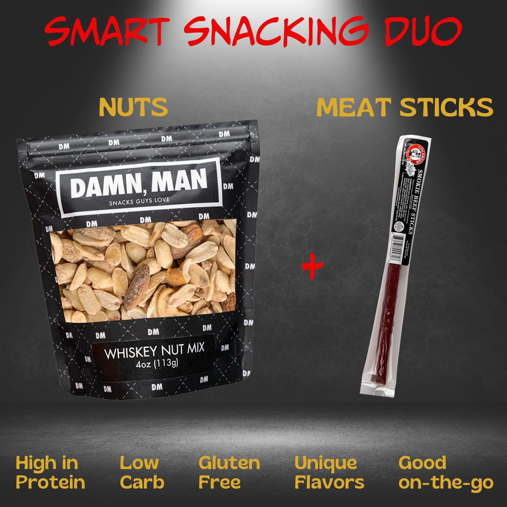 This snack variety pack features an exciting range of flavors crafted from quality ingredients. The beef sticks come in three distinct varieties: Mild Smokey, Spicy Smokie, and Black Pepper Smokie, providing options for all taste preferences. The accompanying nut mixes, including spirit-inspired flavor Nut Mix and malt-inspired Nuts Mix, offer a crunchy and flavorful experience with a blend of nuts and spices.