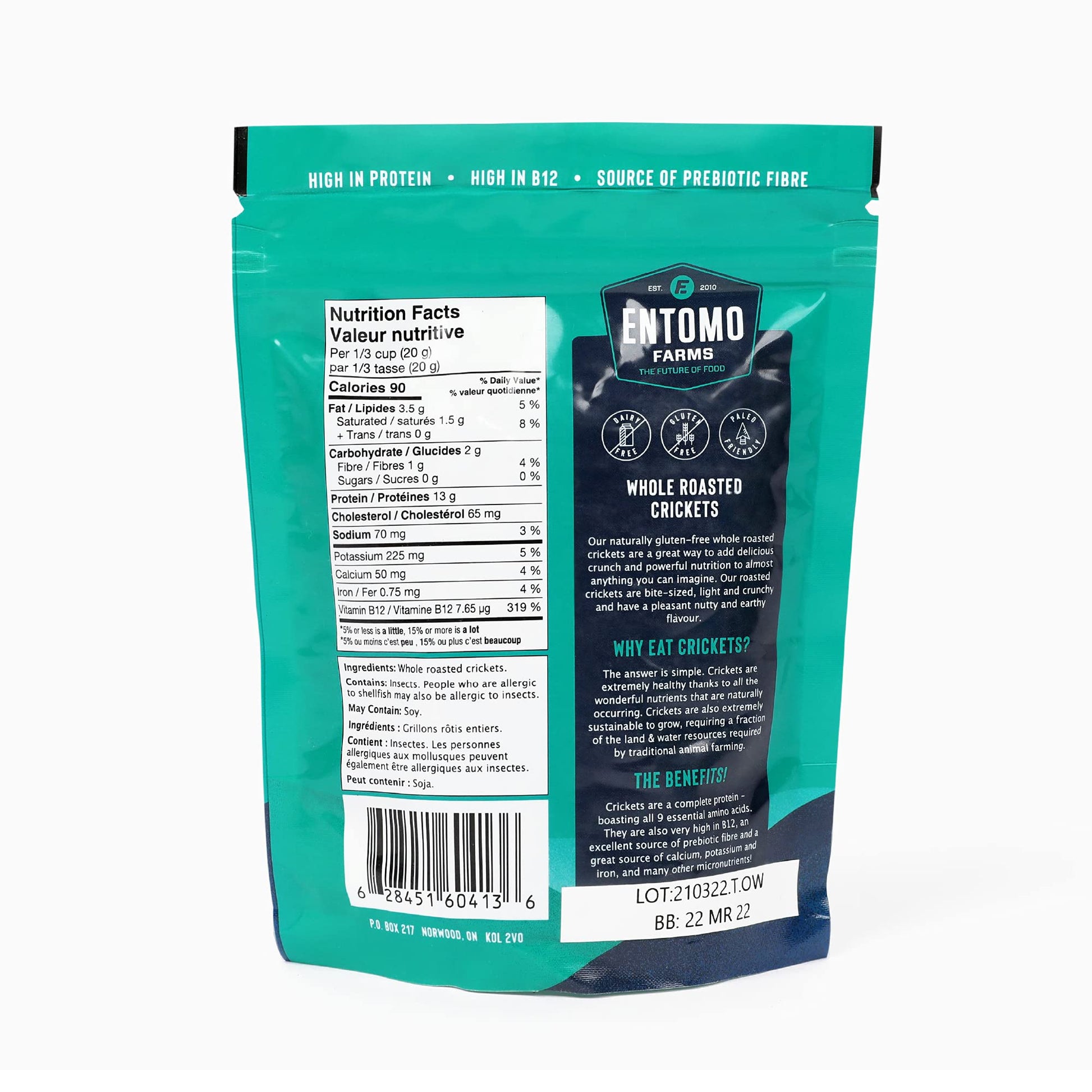 • Q: What are the nutritional benefits of Entomo Farms Whole Roasted Crickets? A: Entomo Farms Whole Roasted Crickets are a powerhouse of nutrition, providing a complete protein source with all 9 essential amino acids. They are rich in B12, fiber, iron, and Omega 3 and 6 fatty acids, boasting almost 70% protein content, more calcium than milk, more iron than spinach, and nearly 20 times more B12 than beef.