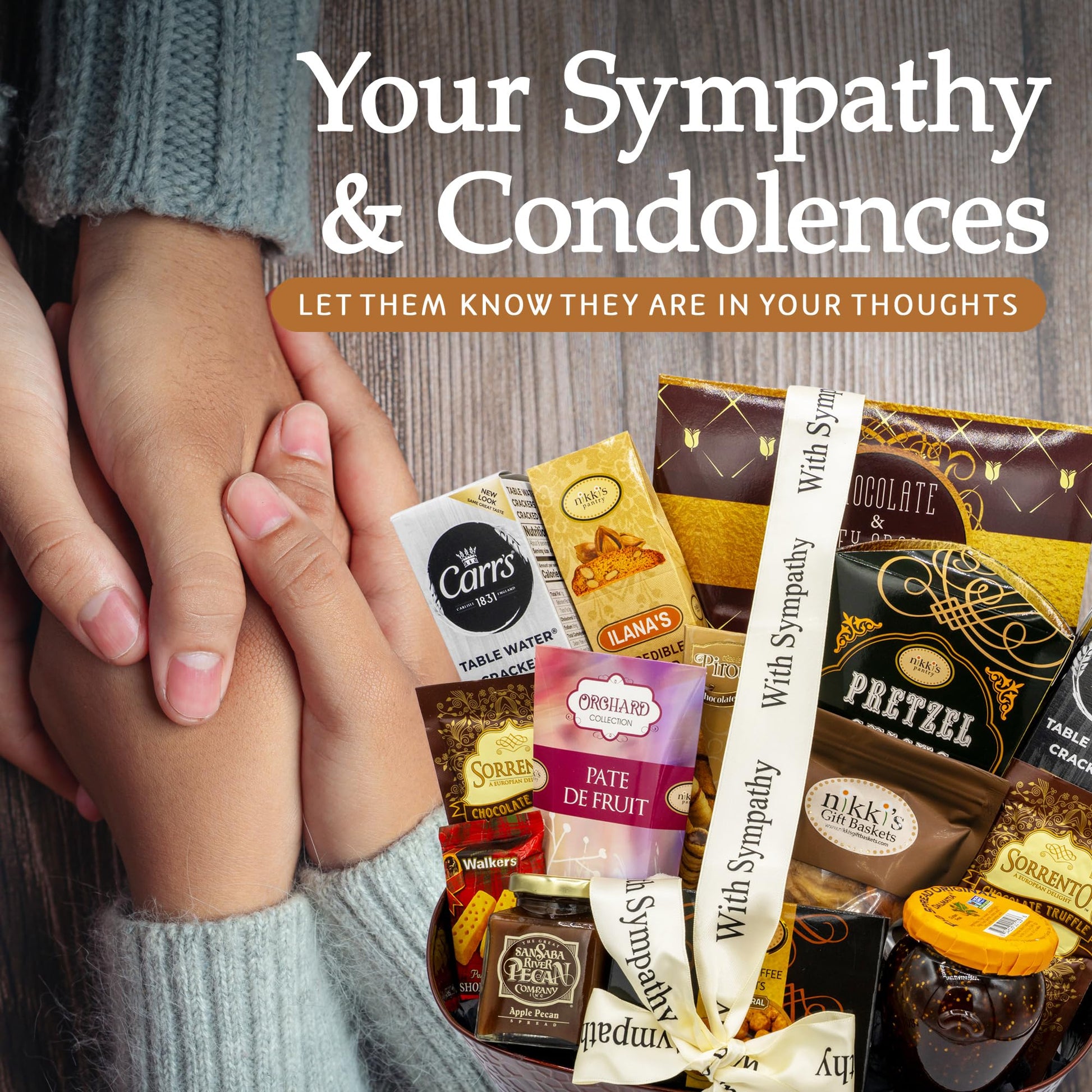 - Q: What items are included in the Sympathy Gift Basket? A: The Sympathy Gift Basket includes a selection of comforting gourmet foods such as Aunt Gloria's Sugar Cookies, Jelly Belly jelly beans, Monet Mini original water crackers, Gourmet Camembert Cheese, Nikki's Butter Toffee Peanuts, Zesty cheddar popcorn, Gourmet caramel corn, and Bellagio dark chocolate and caramel mocha.