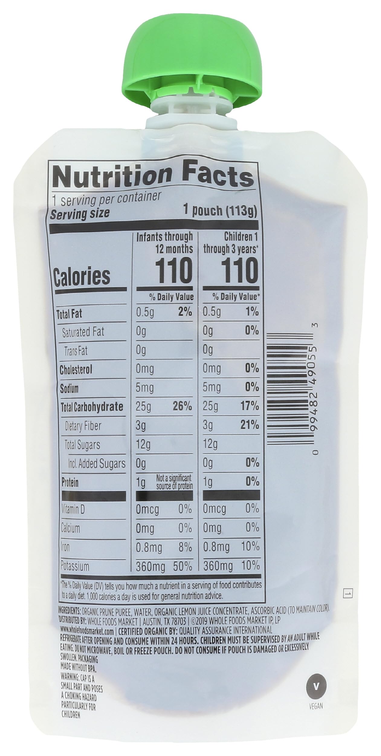 Q: What ingredients are used in 365 by Whole Foods Market Baby Food Prune Organic?A: The 365 by Whole Foods Market Baby Food Prune Organic is made with organic prunes, ensuring that your baby receives a wholesome and nutritious option free from artificial additives.