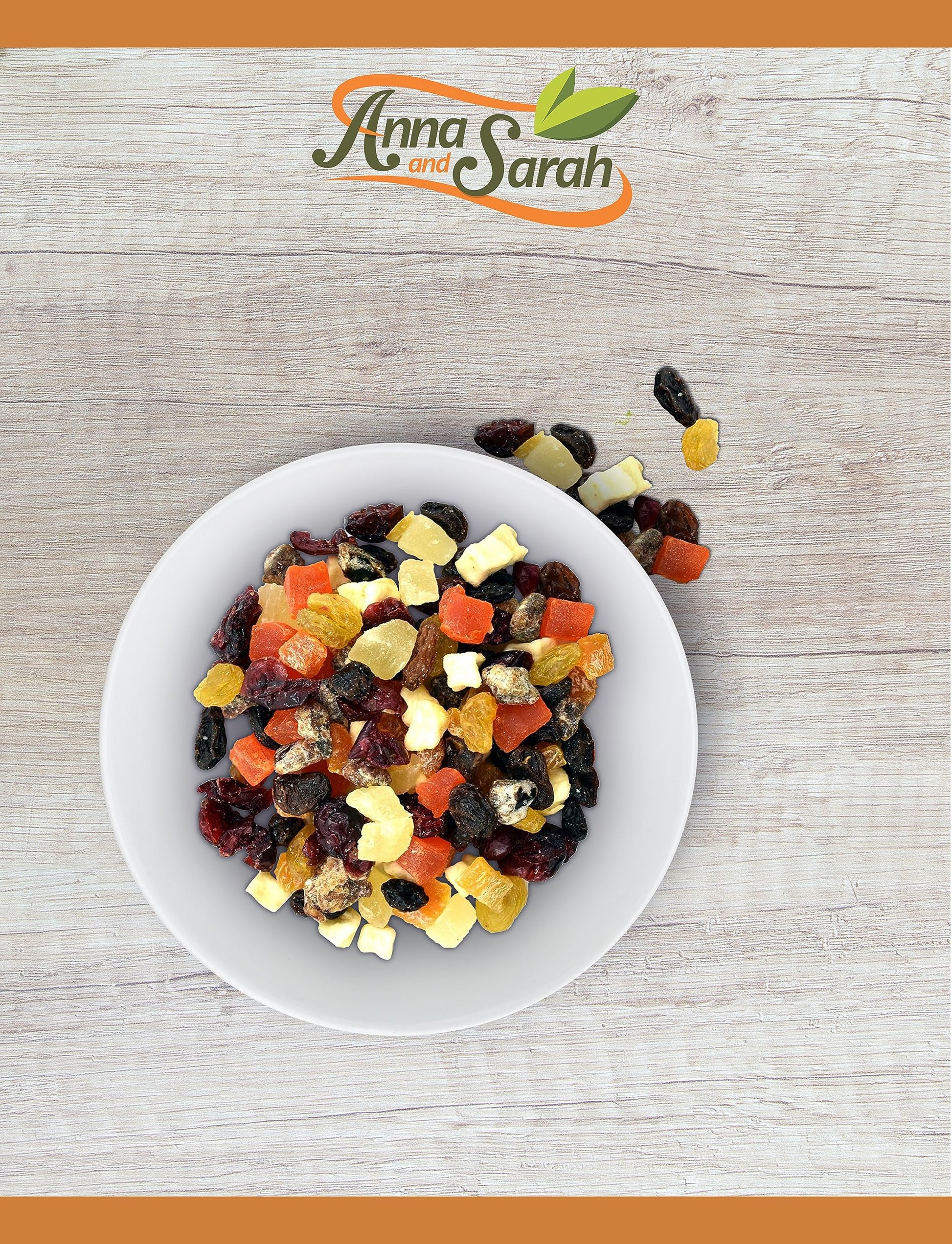 Q: What ingredients are in the Anna and Sarah Mini Fruit Trail Mix?A: The Anna and Sarah Mini Fruit Trail Mix contains a rich assortment of dried fruits including diced pineapple, raisins, golden raisins, diced dates, cranberries, diced papaya, dried apricots, and dried apples.