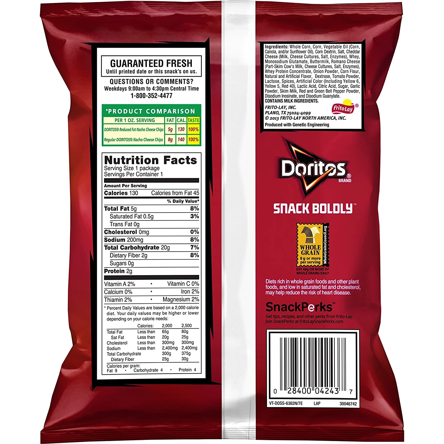 Q: What are the nutritional benefits of Doritos Reduced Fat Nacho Cheese Tortilla Chips?A: Doritos Reduced Fat Nacho Cheese Tortilla Chips contain 25% less fat than regular Doritos, making them a better snacking option for those watching their fat intake. Each 1-ounce bag has only 130 calories, allowing you to enjoy a flavorful snack without overindulging.