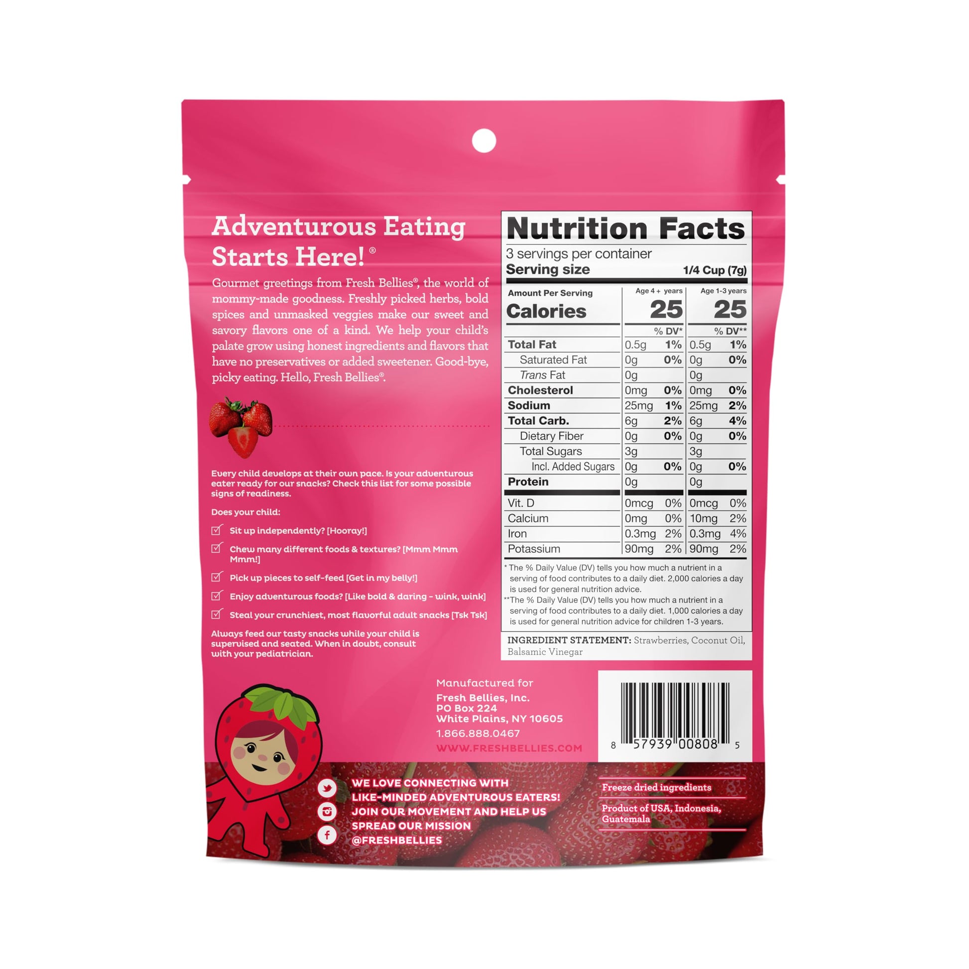 - Q: What are the main ingredients in Fresh Bellies Snack Strawberries Balsamic Freeze Dried? A: Fresh Bellies Snack Strawberries Balsamic Freeze Dried are made with just three non-GMO ingredients: strawberries, balsamic vinegar, and a touch of seasoning. This simplicity ensures a natural taste without any added sugars or preservatives.