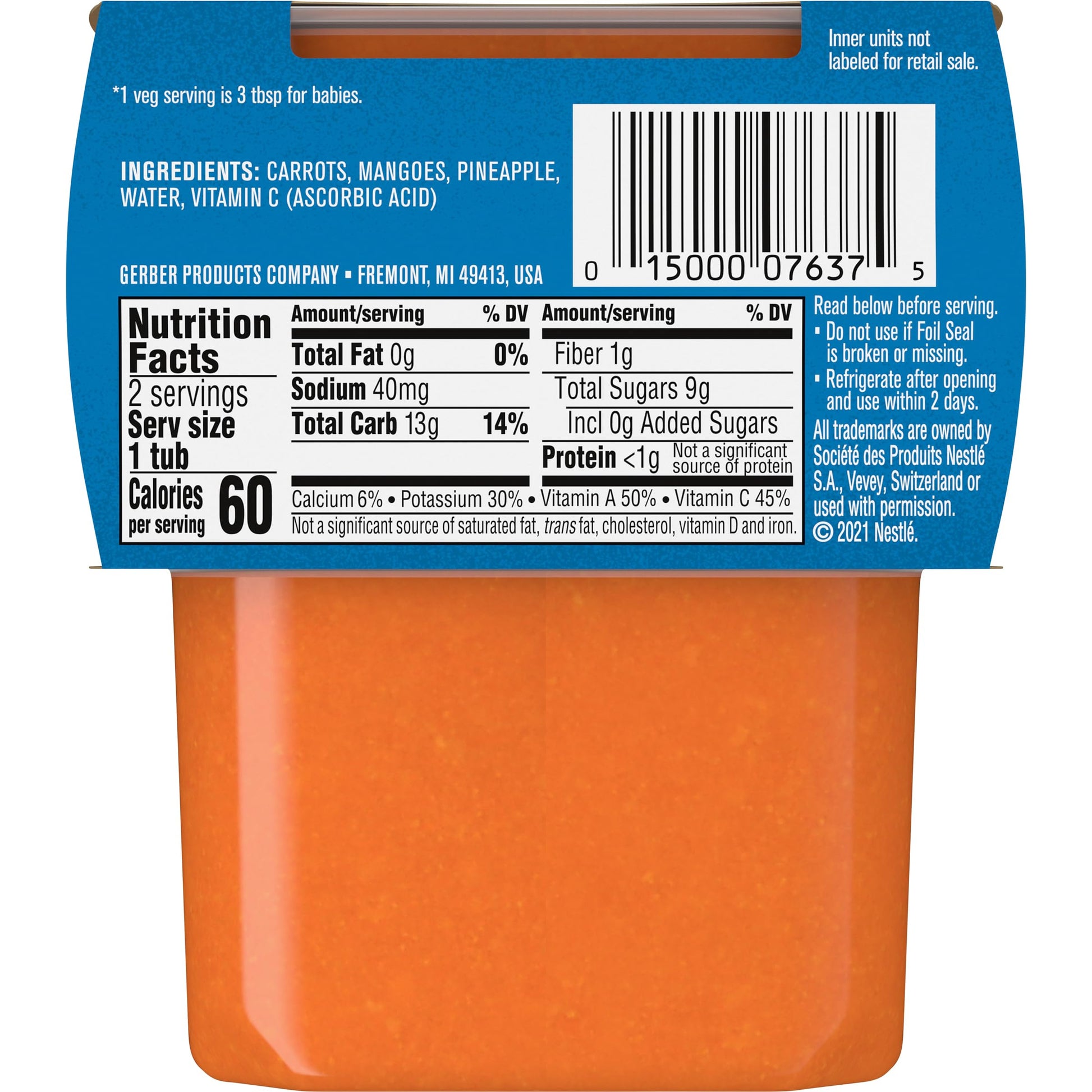 - Q: What ingredients are in Gerber 2nd Foods Carrot, Mango & Pineapple baby food? A: Gerber 2nd Foods Carrot, Mango & Pineapple baby food includes a blend of 4/5 carrot, 2-1/2 tablespoons of mango, and 1 tablespoon of pineapple. All ingredients are non-GMO and contain no added starch.