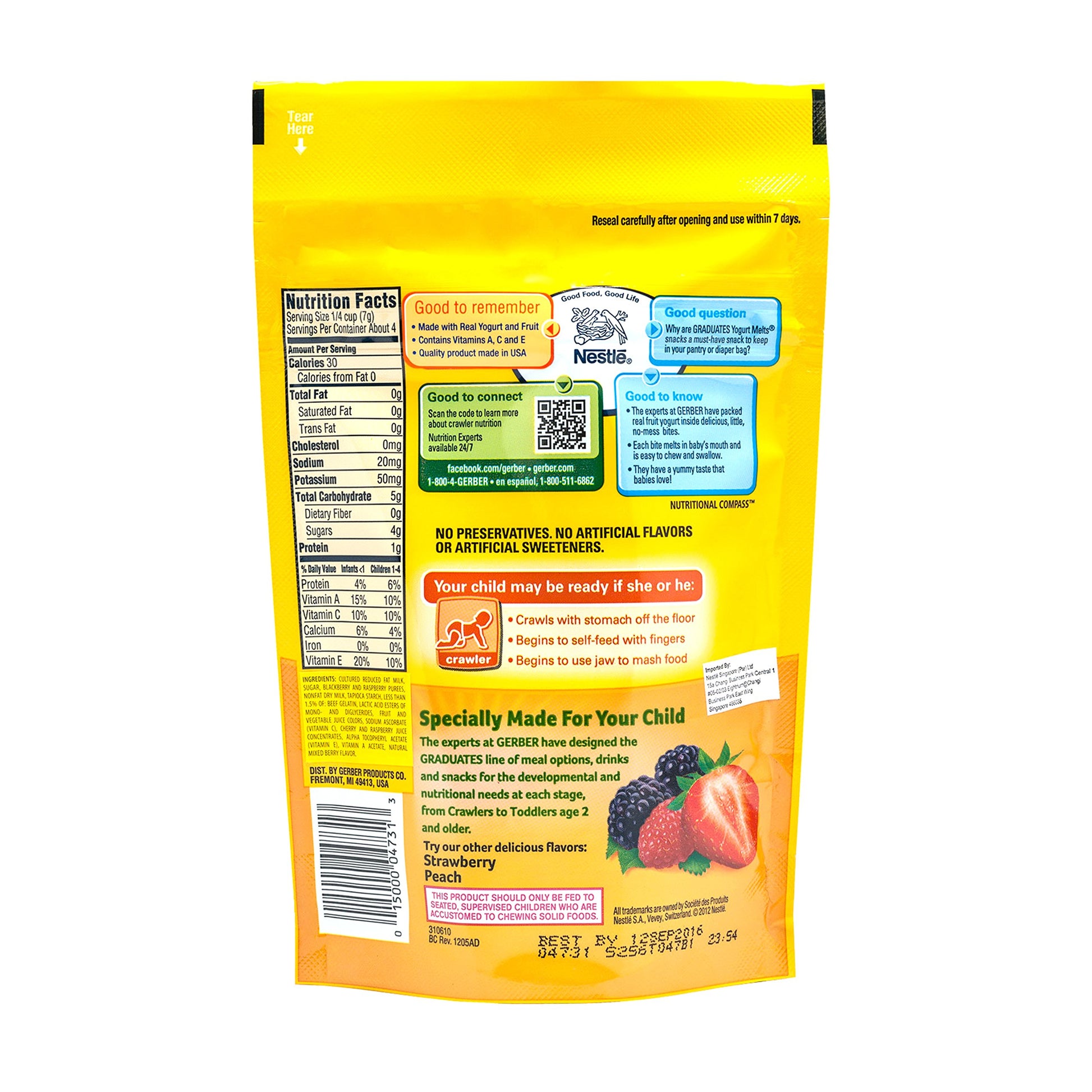 Q: Can I use Gerber Yogurt Melts as a snack for on-the-go?A: Yes, Gerber Graduates Yogurt Melts are perfect for on-the-go snacking. Their lightweight packaging and freeze-dried texture make them easy to carry and a convenient option for busy parents.