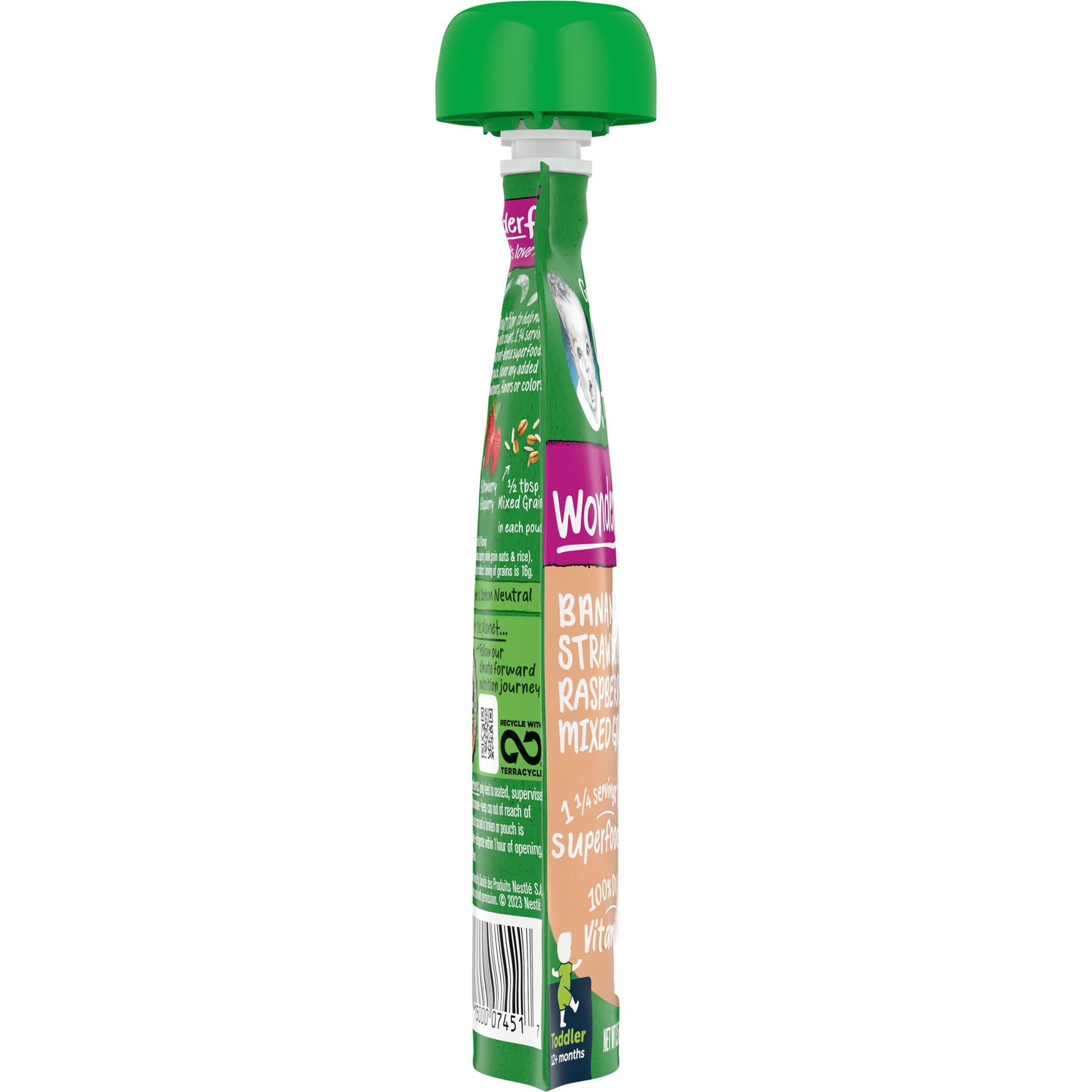 Q: What ingredients are in Gerber Organic Baby Food Pouches?A: Gerber Organic Baby Food Pouches include a blend of 2/5 banana, 2/3 strawberry, 1/2 raspberry, and 1/2 tablespoon of mixed grains, ensuring a nutritious and tasty option for toddlers.