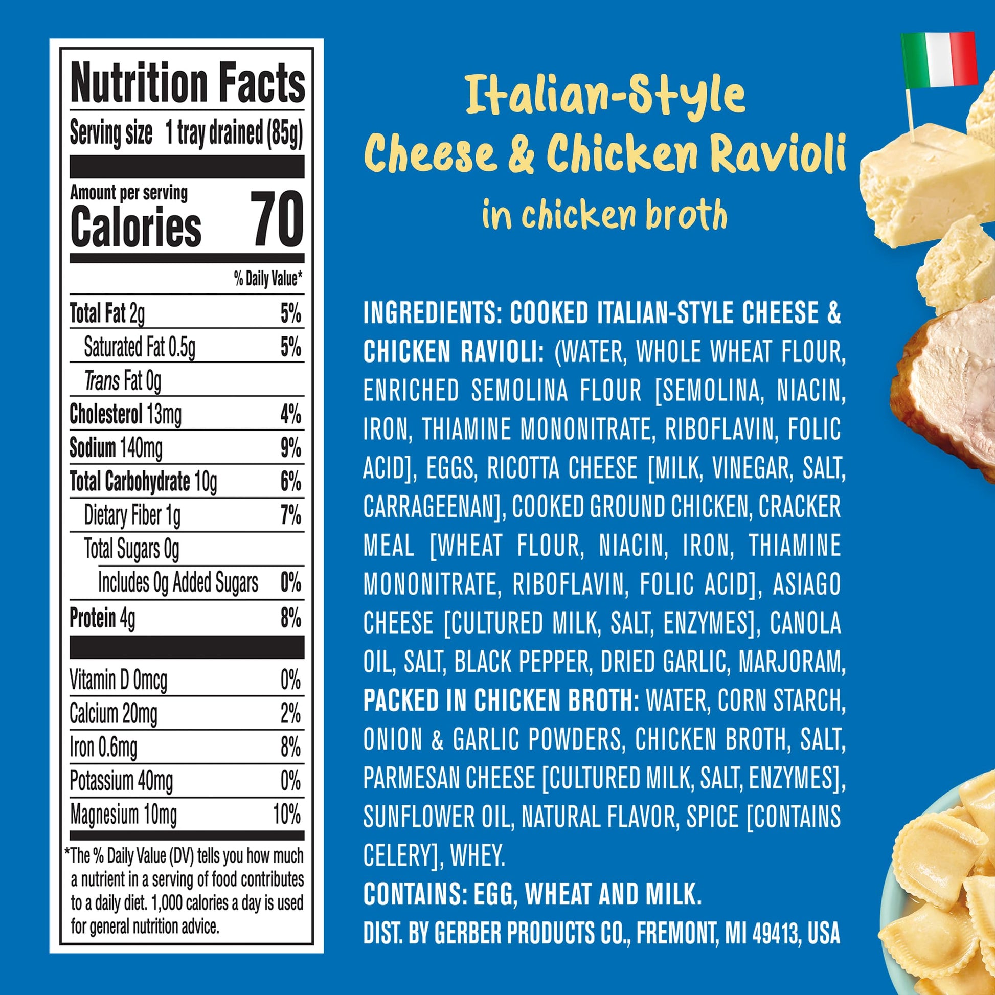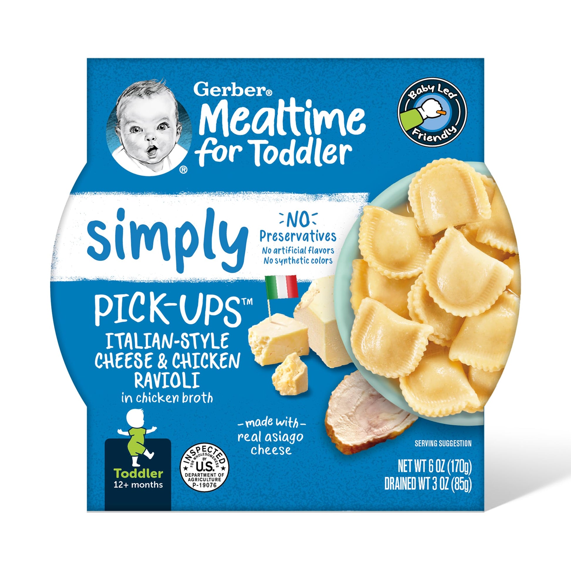 Gerber Italian-Style Chicken & Cheese Ravioli Pick-Ups Are Packed In Chicken Broth And Made With Real Asiago Cheese. Simply, No Preservatives, No Artificial Flavors, No Synthetic Colors. Gerber Italian-Style Chicken & Cheese Ravioli Pick-Ups Are Baby-Led Friendly, Which Can Encourage Your Little One'S Independence While Exploring New Textures And Developing Feeding Skills. Gerber Baby Food Start With Whole Ingredients Like Real Fruits, Veggies & Grains To Help Nourish Your Baby Right From The Start, From Baby Food To Baby Snacks And Toddler Food. The Health And Safety Of Your Little One Has Been And Will Always Be Gerbers Highest Priority. We'Re A Leader In Infant Nutrition, Not Just Because We Grow Food That Will Feed Your Little One, But Also Because We Know What Nourishment Your Little One Needs.