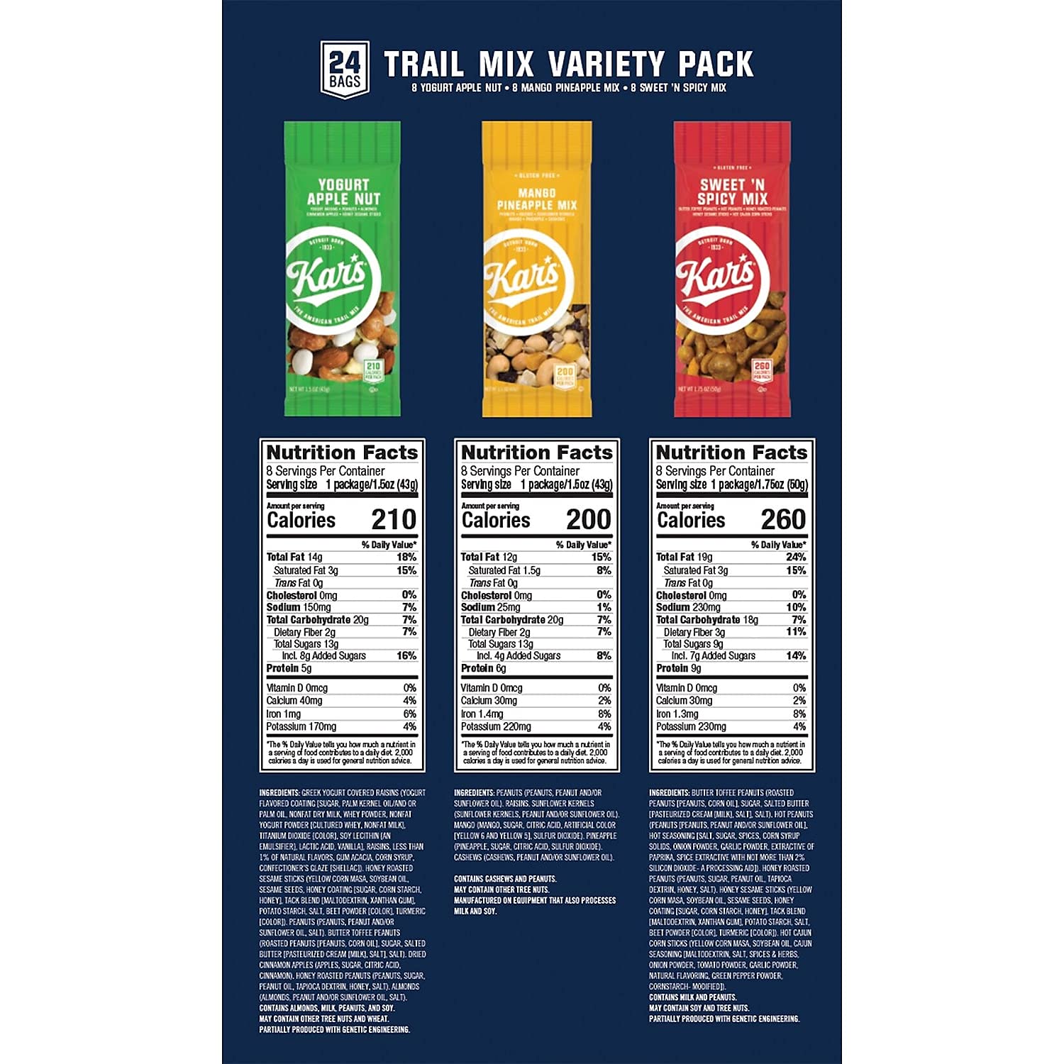 Q: What flavors are included in Kar's Trail Mix Variety Pack?A: Kar's Trail Mix Variety Pack includes three delicious flavors: Yogurt Apple Nut, Mango Pineapple, and Sweet ‘N Spicy. Each box contains eight bags of Mango Pineapple, eight bags of Yogurt Apple Nut, and twelve bags of Sweet ‘N Spicy.
