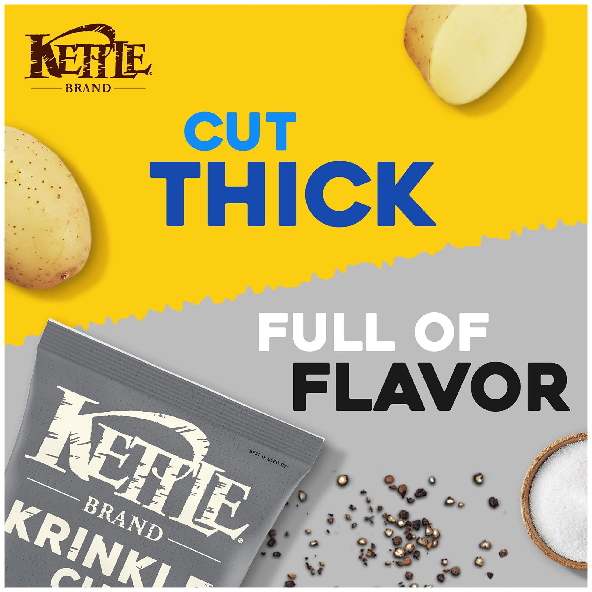 Get your crunch on with Kettle Brand Krinkle Cut Salt and Fresh Ground Pepper Kettle Potato Chips. Kettle Brand Krinkle Cut Salt and Pepper Chips are sliced thicker than our classic kettle chips for an extra crunch. And their deep ridges hold all the extreme seasoning they need. These wavy chips are sprinkled with a much-loved combo: a kiss of salt and the kick of ground pepper. All of our kettle cooked chips are Certified Gluten Free and Non-GMO. This 7.5-ounce bag contains about 8 servings and is perfect for stashing in your pantry so you can satisfy your craving for salty snacks whenever it strikes. Enjoy these bold, flavorful chips on their own or as a side with sandwiches, burgers and more. When you open a bag of Kettle Brand chips, you know you re getting incredible kettle cooked potato chips made with authentic recipes by real people. In addition to Salt and Fresh Ground Pepper, Kettle Brand Krinkle Cut gluten free chips are available in Truffle and Sea Salt, Habanero Lime, and Dill Pickle. No matter the recipe, every hearty bite of Kettle Brand chips is packed with irresistibly bold flavor.