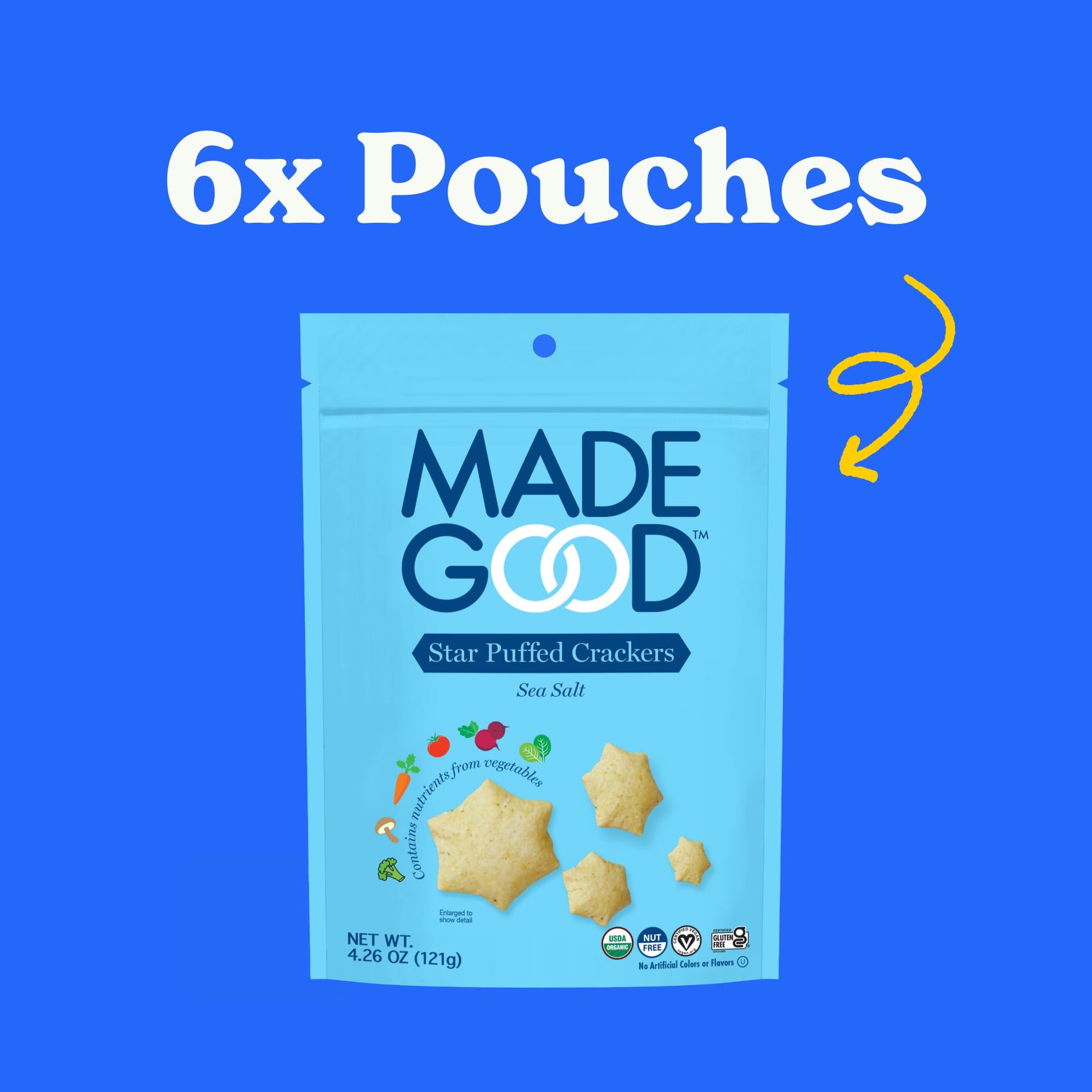 Madegood Sea Salt Star Puffed Crackers Are The Salty, Savory Snacks You Remember Growing Up, Now With A Healthier Twist. Made With Simple, Wholesome Ingredients Like Cassava Flour And Oat Flour, These Are Snacks You Can Feel Good About Feeding Your Kids, And Yourself! These Delicious Crackers Are Vegan, Non-Gmo, Gluten Free, Allergy Friendly, And Usda Organic. These Gluten Free Snacks Are Individually Packed With The Nutrients From Vegetable Extracts To Provide Nourishment For Kids And Adults. Whether At Home, School Or Work, Madegood Star Puffed Crackers Are Delicious, Allergy Friendly, Safe To Serve, And Individually Packaged. All Madegood Products Are Baked In A Dedicated Allergen-Free Bakery. Madegood Was Started To Share A Family'S Love For Good, Healthy Snacks, But It Was Also Started To Do Some Good In The World. Good Is For Everyone - High Standards, Quality, And Transparency. Were Committed To Baking Better Snacks Right Down To The Carbon Footprint. Contains 6 Resealable Bags, 4.26 Ounces Each.