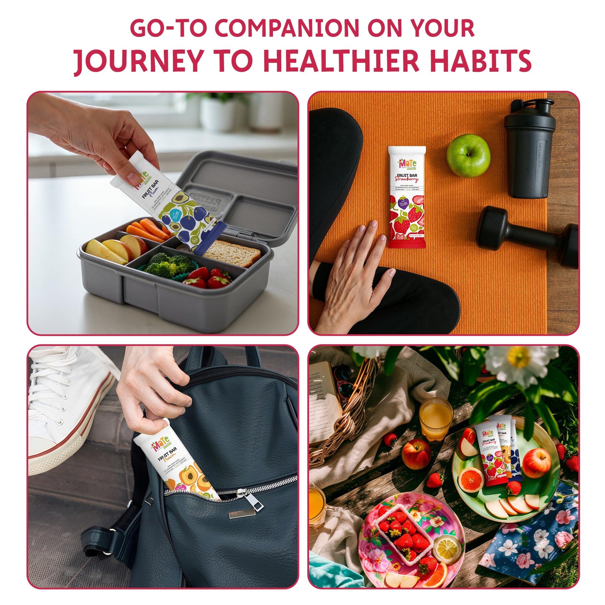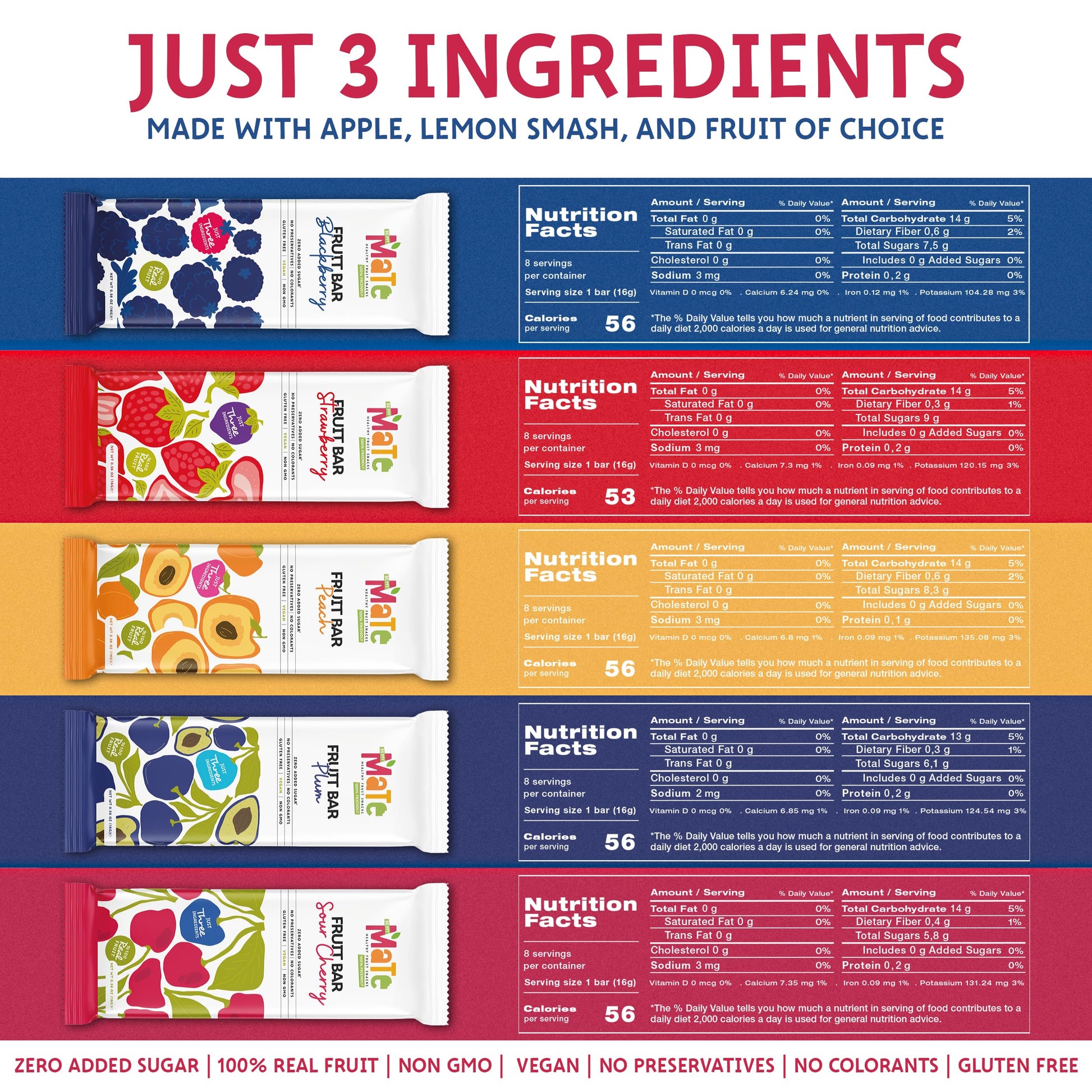 Mate Fruit Bars bring a burst of fruity goodness to your day. Our ingredients are 100% real fruit, and all the taste and sugar come from nature. Feel our natural fruit texture on your tongue as if biting on an actual fruit. This variety pack includes 40 individually wrapped 0.56 ounce strips in five delicious flavors: strawberry, plum, peach, blackberry, and sour cherry. Theyre perfect for stocking up the family snack box or pantry, ideal for lunchboxes or on-the-go moments. Imagine a world where healthy snacking isnt just a boring routine anymore but a joyful experience that supports your well-being. Thats always been our vision when we created Mate. Weve set out to create a delicious combination of taste and health. No more compromising from your sweet crush