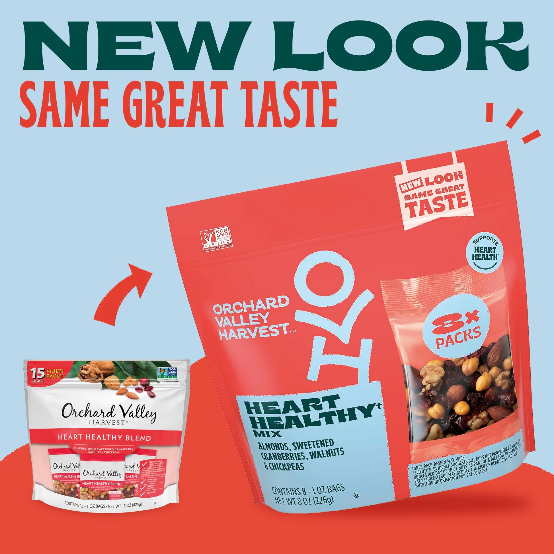 Orchard Valley Harvest Heart Healthy Mix is a divine indulgence for your taste buds, packaged conveniently in a 1 oz bag for on-the-go snacking at work, school, on your own, or sharing with others. In this salty medley, prepare to savor the crave-worthy mix of almonds, dried sweetened cranberries, walnuts and chickpeas, delivering a harmonious blend of flavors and textures that are sure to bring joy to your day.Whether you want to treat yourself after a long day or share the irresistible pleasure with loved ones, our Heart Healthy Mix is the perfect choice. And the best part? You can enjoy this guilt-free indulgence as this flavorful snack is gluten-free, Non-GMO Project verified, and free from artificial colors, flavors, and preservatives.Experience the joy of snacking responsibly and deliciously with Orchard Valley Harvest Heart Healthy Mix - a treat that is as delightful for your taste buds as it is for your conscience. Embark on a truly satisfying and compassionate snacking journey.