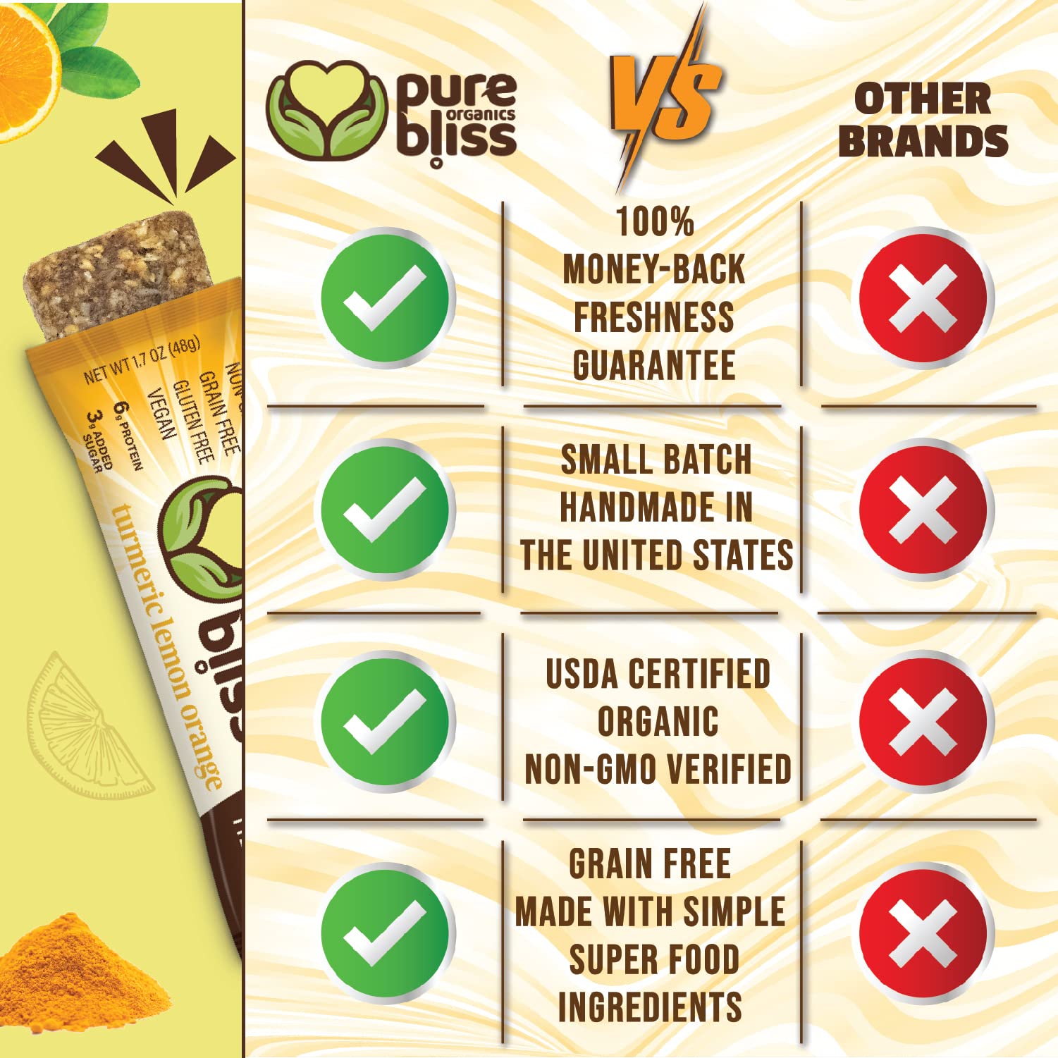Turmeric Lemon Orange Bar - Organic, Non-GMO, Grain-Free, Gluten-Free, Vegan - Cashew Butter - 12 Pack Pure Bliss Organics offers a plant-based snack bar made with cashew butter, citrus, turmeric, and other organic ingredients. These bars are grain-free, gluten-free, and formulated for those following vegan, paleo-friendly, or clean-label diets. Each bar features a blend of lemon, orange, and turmeric, offering a citrus-forward flavor with subtle spice. Made without dairy, soy, or artificial additives, they provide a convenient option for on-the-go snacking, pre- or post-workout fuel, or a midday plant-based bite. Produced in a certified gluten-free bakery in the United States, Pure Bliss Organics bars are crafted in small batches to maintain quality and consistency. All bars are made using recognizable ingredients and are free from GMOs and common allergens. Each box contains twelve 1.7 oz individually wrapped bars-suitable for lunchboxes, gym bags, travel kits, or pantry storage. Pure Bliss Organics is committed to creating real food snacks made with organic, plant-based ingredients to meet the needs of active individuals and mindful eaters.