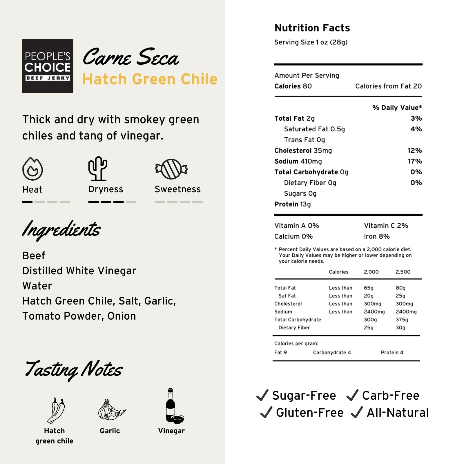 CARNE SECA - SOUTHWESTERN FLAVOR, MEXICAN HERITAGE Peoples Choice Carne Seca Hatch Green Chile Beef Jerky blends the regional flavor of New Mexico chiles with traditional Mexican-style dried beef. Whole cuts of 100% USA beef are sliced thick, marinated in distilled white vinegar, and seasoned with Hatch green chiles, onion, garlic, and tomato. This jerky has a dry texture, bold smoky flavor, and bright tangy finish-made to celebrate the natural flavor of beef. 13g protein per serving 0g sugar, 0g carbs Sugar free, gluten free, soy free, nut free No preservatives, no MSG Crafted in our Los Angeles jerky kitchen by a family business with over 90 years of tradition.