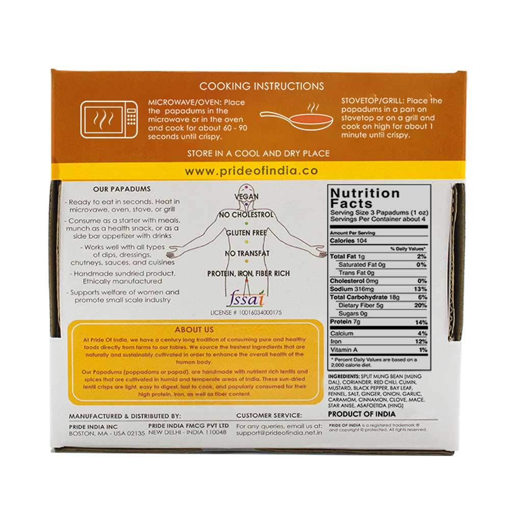 Pride of India incorporates naturally-grown food and herbal products from India into our daily life. These all-natural ingredients help enhance the overall health of the human body. Pride of India is family owned and operated, and we manufacture our products in the USA. Indian papadums (poppadoms or papad) are a traditional Indian snack food. They are similar to tortillas and flatbreads. Our papadums are made of chickpeas, lentils and Indian spices. Lentils contain healthy protein, iron, and fiber. Plus, they help reduce cholesterol. Because these lentil crisps are gluten free and dont have trans fats, they are a healthier snack than traditional potato chips. These papadums are also handmade by women in India, and each purchase of these lentil crisps contributes to small businesses and women empowerment in India. Popadums are usually made as a dough that needs to rest before baking. These lentil crisps, however, are ready in seconds! Just put them over a heat source (oven, microwave, stove, etc.) for 60 to 90 seconds until crispy. Lentil crisps are a great meal starter or snack. With an intoxicating blend of Indian spices, you can eat them alone or dip them in sauces, curries, or hummus. This package contains 10 flavourful tikka curry papadum. Try other flavors of lentil crisps, and shop other health and beauty products by Pride of India.
