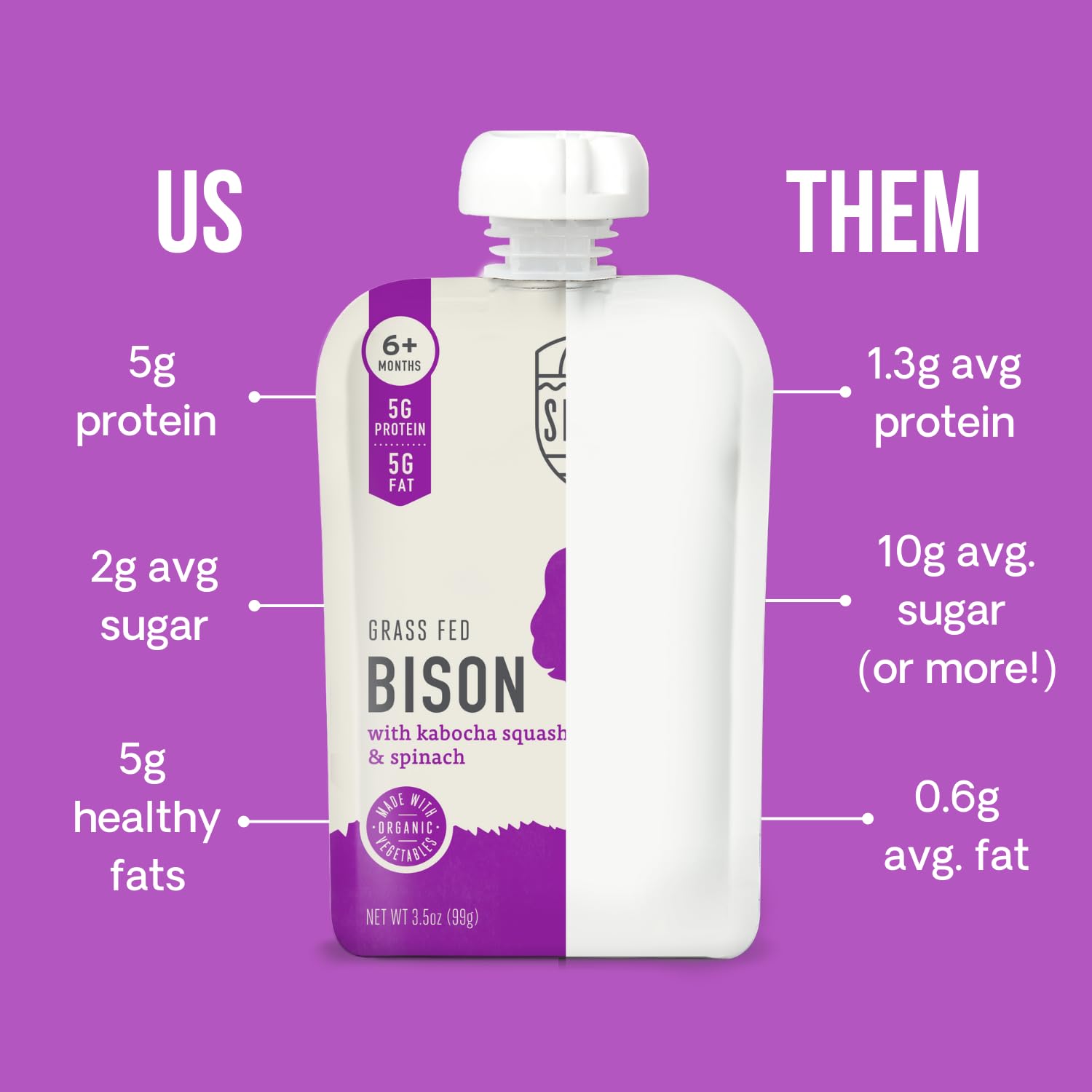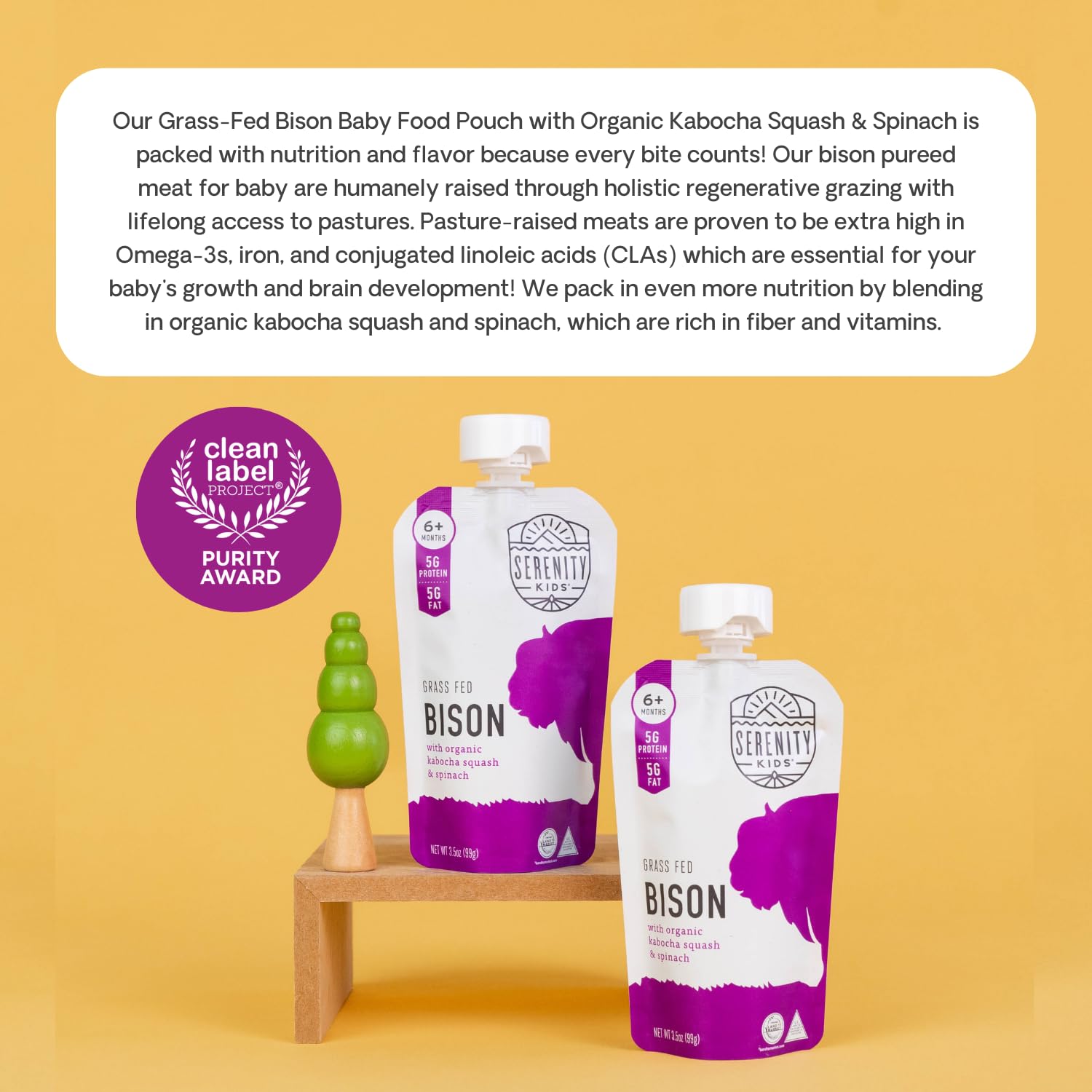 Bison Baby Food Puree: Experience 6 Pouches Of Serenity Kids Baby Food Puree, Crafted With 100% Grass-Fed Bison, Organic Kabocha Squash, And Spinach. Perfect For Your Baby Bison'S Adventurous Palate, Each Bison Pouch Puree Is Made In The Usa | Savory Protein Power: These Bison Meat Pouches Pack More Protein And Fats Than Sugar, Introducing Your Little One To The World Of Savory Food, Way Beyond The Typical Baby Snack. Each Bite Of This Meat Baby Food Puree Is A Step Towards A Healthier, Brighter Future | Veggies Over Sugar: Our Baby Food Puree Pouches Focus On Veggies, Not Sugary Fruits, Expanding Your Baby'S Taste Buds With Balanced And Nutritious Meals. This Baby Food Serenity Kids Pack Is All About Providing Wholesome Flavors In Every Meat Puree Pouch | Ethical & Wholesome: Mimicking Breast Milk'S Macronutrients, These Bison Puree Pouches Are Made With Ethically Sourced Meats And Organic Veggies. Free From Artificial Flavors And Allergens, The Serenity Kids Pouches Bison Are A Pure, Honest Choice For Your Little One | Meat For Minis: According To The Usda, Babies Can Enjoy Meat At Around 6 Months. Our Baby Meat Pouch Options, Including Bison, Chicken, Turkey, Salmon, And Beef, Make It Easy To Introduce Nutrient-Rich Foods To Your Growing Baby. Feel Confident Choosing This Bison Meat Baby Food Pouch For Your Family | Clean Label Project Purity Award Winner: This Certification Verifies Rigorous Ingredient Testing For Over 400 Contaminants, Including Chemicals Of Concern And Industrial And Environmental Toxins And Contaminants (Like Heavy Metals, Pesticide Residues, And Plasticizers) | Support Regeneration: By Choosing The Serenity Kids Bison Puree Pouch, You'Re Backing Regenerative Agriculture. We'Re All About Promoting Soil Health, Biodiversity, And Sustainable Meat Production, Making Our Baby Meat Puree Good For Your Baby | Recycle Your Pouches: Create A Terracycle Account And Start Collecting Finished Serenity Kids Baby Food Pouches In The Freezer To Prevent Any Odors. When Ready, Place The Collection Into Any Box You Have At Home And Log Into Your Account To Download And Print A Pre-Paid Shipping Label. Seal Your Collection Box, Tape On The Printed Shipping Label, And Send It Via Ups To Be Recycled. Feel Good Knowing That Terracycle Gives Your Pouches A Second Life! | Family Owned Company: We'Re Here For You And Your Little One! If You Have Any Questions, Concerns Or Feedback, Please Reach Out To Us!