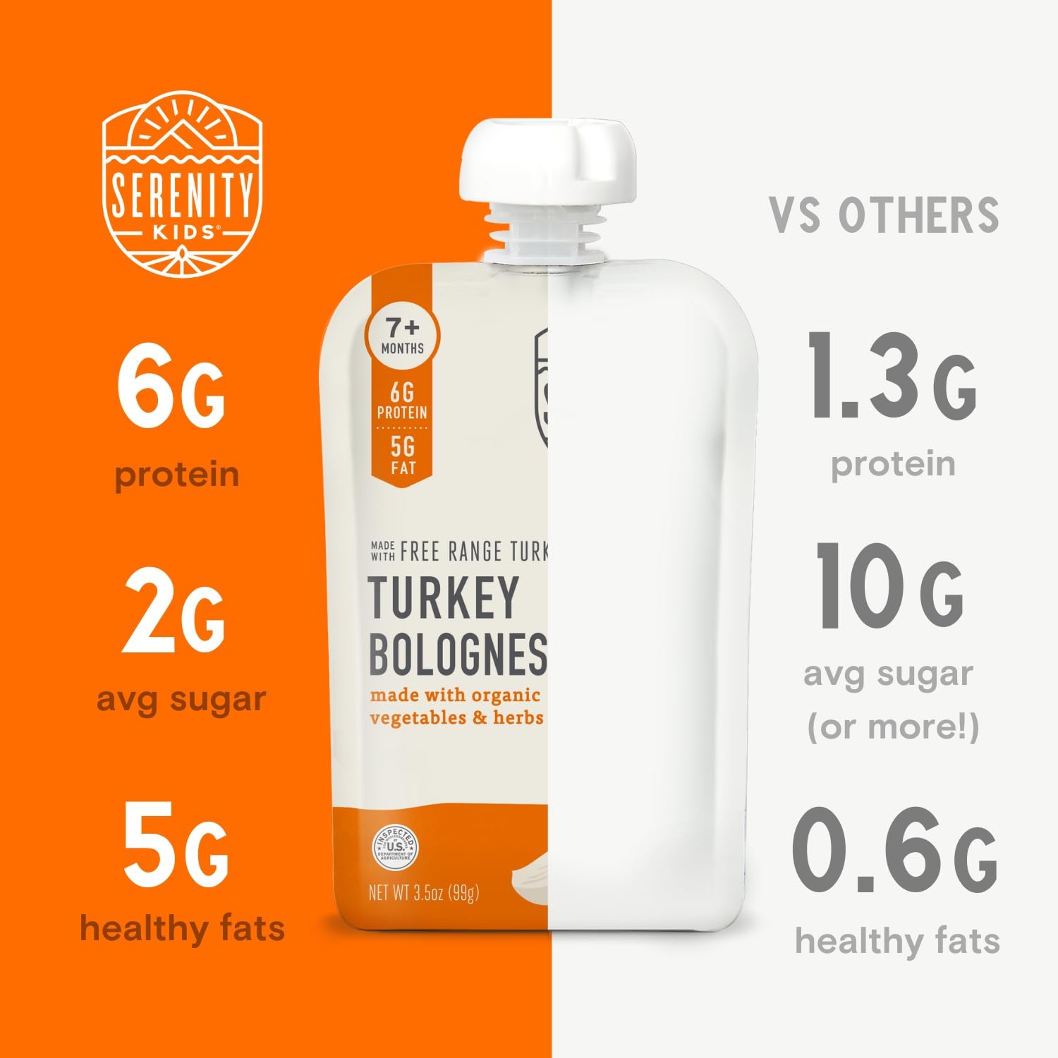 Savory Turkey Bolognese: Dive Into 12 Pouches Of Tasty Turkey Bolognese Made With Organic Turkey Bone Broth. Packed With Organic Veggies And Herbs, These Serenity Kids Pouches Are Perfect For Expanding Your Toddler'S Taste Buds With Rich, Savory Flavors | Perfect Savory Blends: Our Baby Food Pouches Have More Protein And Fats Than Sugar, Ensuring Your Little One Gets Maximum Nutrition Per Bite. These Kids Pouches Are Awesome For Introducing Your Toddler To The World Of Savory Foods | No Sugary Fruits: Skip The Sugary Fruits And Enjoy A Boost Of Protein In Every Turkey Baby Food Pouch. It'S A Spot-On Choice For High-Calorie Baby Food Turkey Puree That Keeps Your Baby Full And Satisfied | Mindfully Made: Our Turkey Bone Broth For Kids Is Rich In Easily Digestible Protein And Amino Acids, Supporting Your Toddler'S Growth With Ingredients That Help Build Tissue And Joints. This Turkey Baby Food Is As Wholesome As It Gets | Clean Label Project Purity Award Winner: This Certification Verifies Rigorous Ingredient Testing For Over 400 Contaminants, Including Chemicals Of Concern And Industrial And Environmental Toxins And Contaminants (Like Heavy Metals, Pesticide Residues, And Plasticizers) | Convenient And Safe: These 3.5-Ounce Pouches Are Perfect Snacks For Busy Parents. Made In The Usa, They'Re Free From Preservatives And Gmos. Just Refrigerate After Opening And Serve Within 24 Hours For Best Results