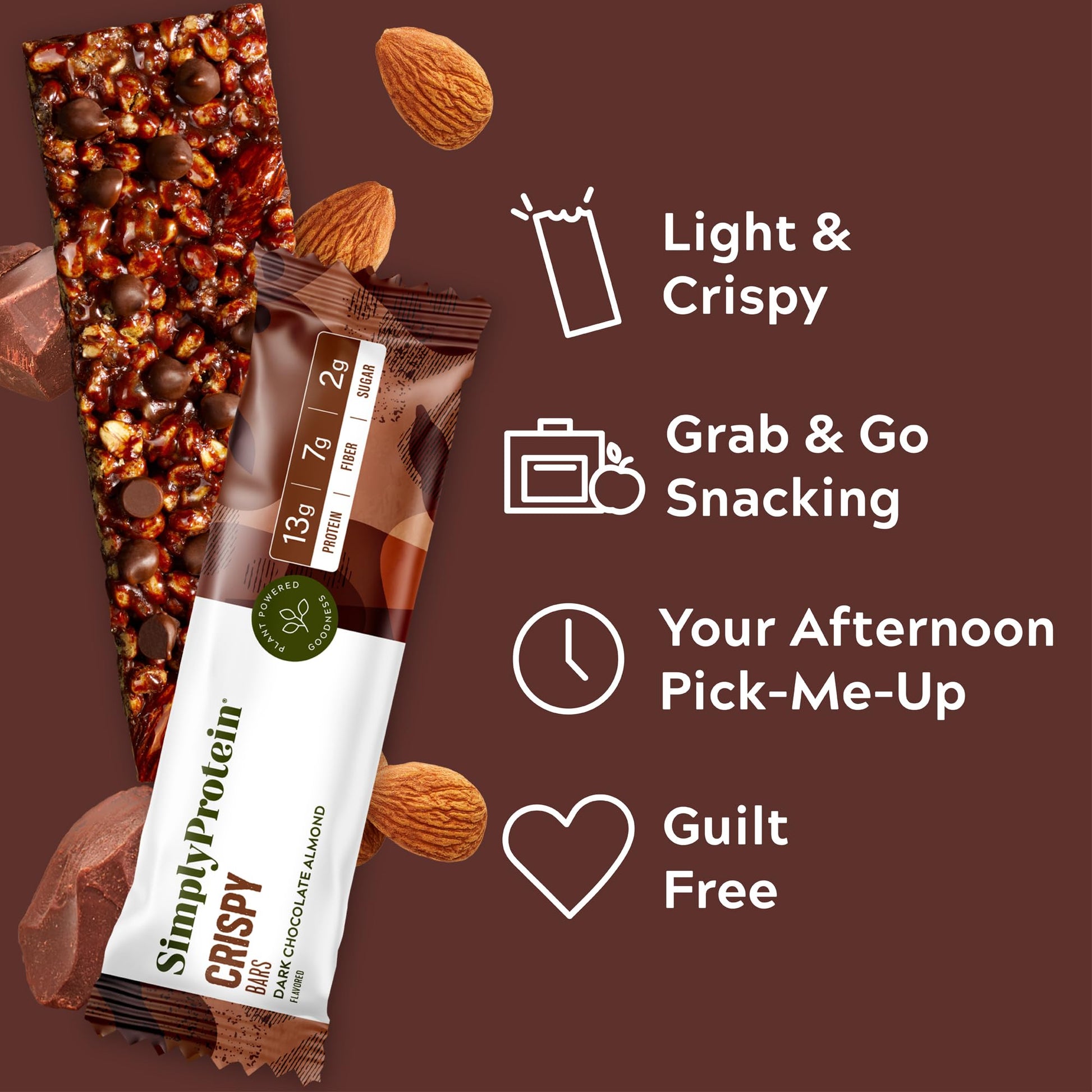 Dark Chocolate Almond - Decadent chocolate is devilishly good, but even better when paired with real roasted almonds. This snack bar has only 160 calories and is made to help fuel your day - wherever it takes you. Low Carb, Low Sugar, and High Fiber. | The Original Bar that Started it All - Packed with 13g of Protein, 2g of Sugar, and 7g of Fiber, our Crispy Bars combine delicious natural flavors with a light and crispy texture for a healthy food option you can enjoy wherever you are. | Made With Only the Good Stuff - Our bars are plant-based, kosher certified, non-GMO, rich in fiber, and gluten-free. Theyre also a good source of iron and contain calcium and potassium, making them ideal on-the-go snacks or pre/post-workout energy bars. | Keep It Simplyfied - Lifes complicated, but sticking to your healthy goals doesnt have to be. Simply Protein offers a variety of tasty and nutritious plant-based protein foods, from protein shakes to breakfast bars. Enjoy them all, guilt-free. | Why Simply Protein? - Our mission is, well, Simple. We will nourish people as if they are family, support the community like they are old friends, and take care of the planet like it was our own backyard. Simple. Delicious. Plant Powered Goodness for All.