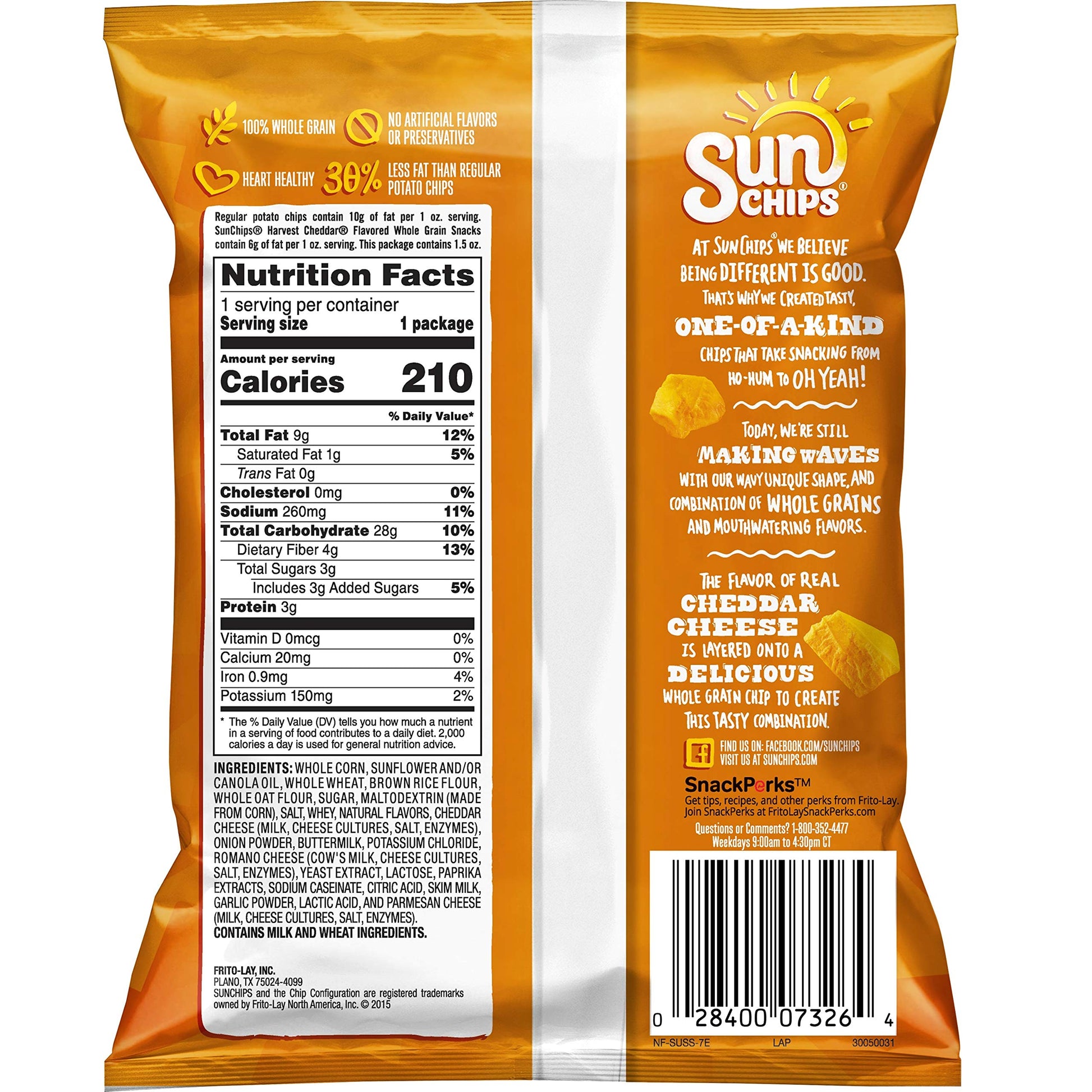 Q: What are the main ingredients in SunChips Harvest Cheddar?A: SunChips Harvest Cheddar are made with 100% whole grains, providing a delicious and nutritious snack option. The exact ingredient list includes whole corn, whole wheat, and cheddar cheese flavoring.