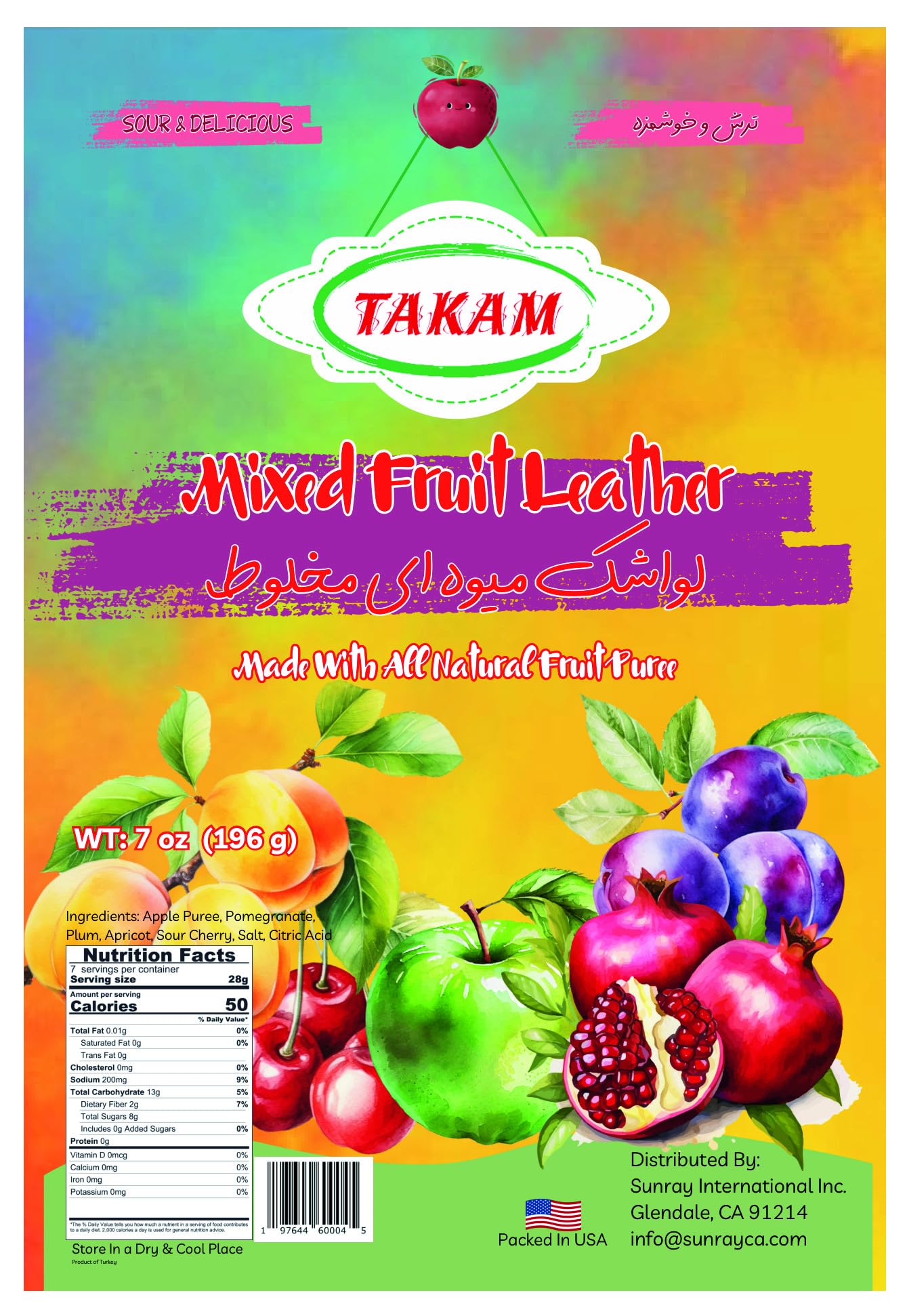 Takam Lavashak Mixed Fruit Leather Authentic Persian Style Sweet and Salty Fruit Layer 7 OZ - 196g ????? ?????? ????? Explore the diverse and vibrant flavors of Persia with Takam Lavashak Mixed Fruit Leather. This 7 oz pack is a delightful fusion of traditional Persian snack culture and a medley of rich flavors, combining apple, pomegranate, plum, sour cherry, and apricot into one exquisite chewy fruit leather. Each bite is a journey through the sweet, sour, and slightly salty tastes that embody the essence of Persian culinary tradition. Perfect for those who love variety and richness in their snacks, our mixed fruit leather is a wholesome choice for all ages.