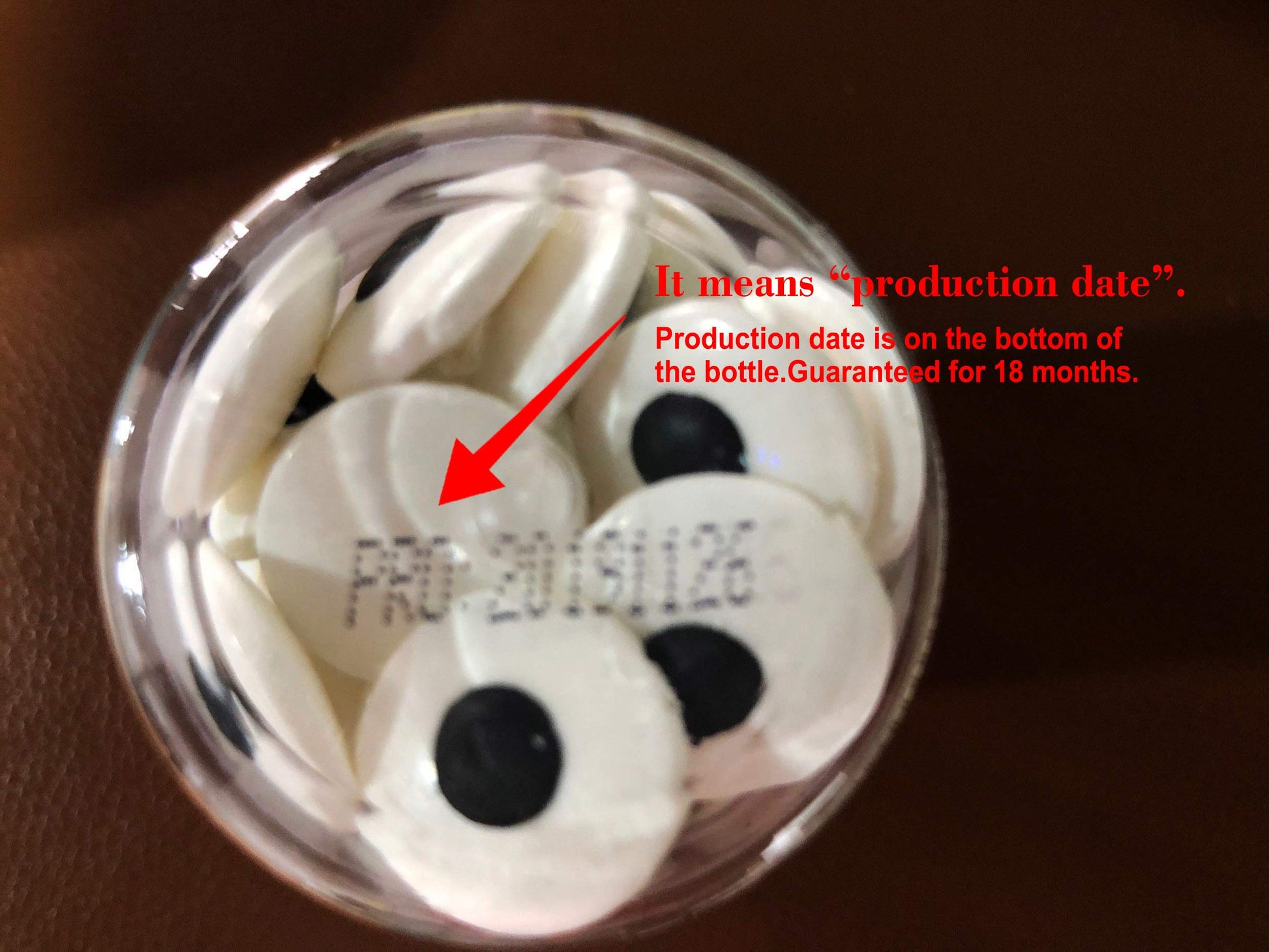 • Q: How should I store the candy eyeballs to maintain their freshness? A: To keep the candy eyeballs fresh, store them in a cool, dry place. After opening the seal on the bottle, it's best to use them within one month to ensure optimal taste and quality. The production date is printed on the bottom of the bottle, and they are guaranteed for 18 months if unopened.
