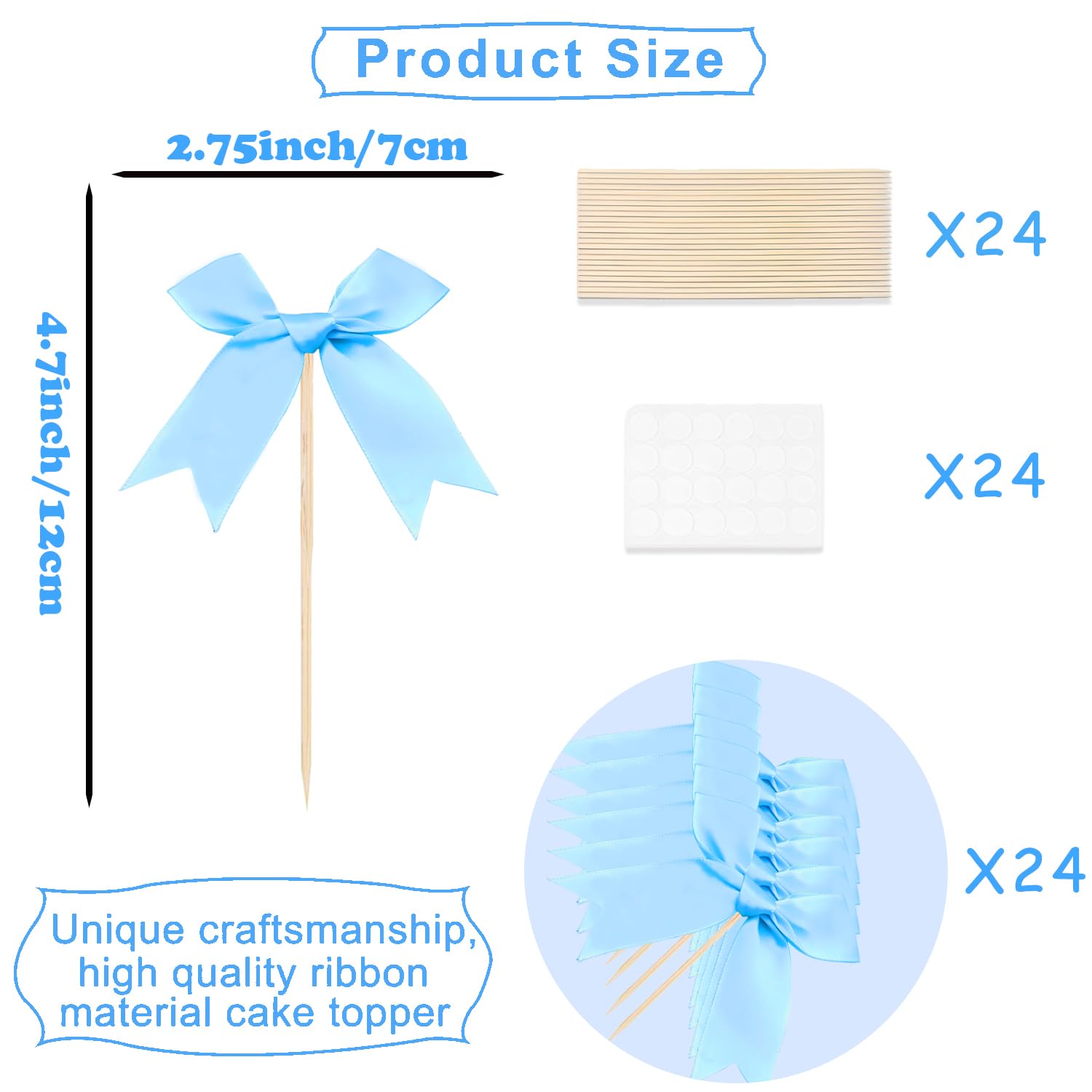 Q: What is included in the package of blue bow cupcake toppers?A: The package includes 24 blue bow cupcake toppers, providing you with ample decorations for your event, ensuring that every cupcake is adorned with a charming bow.
