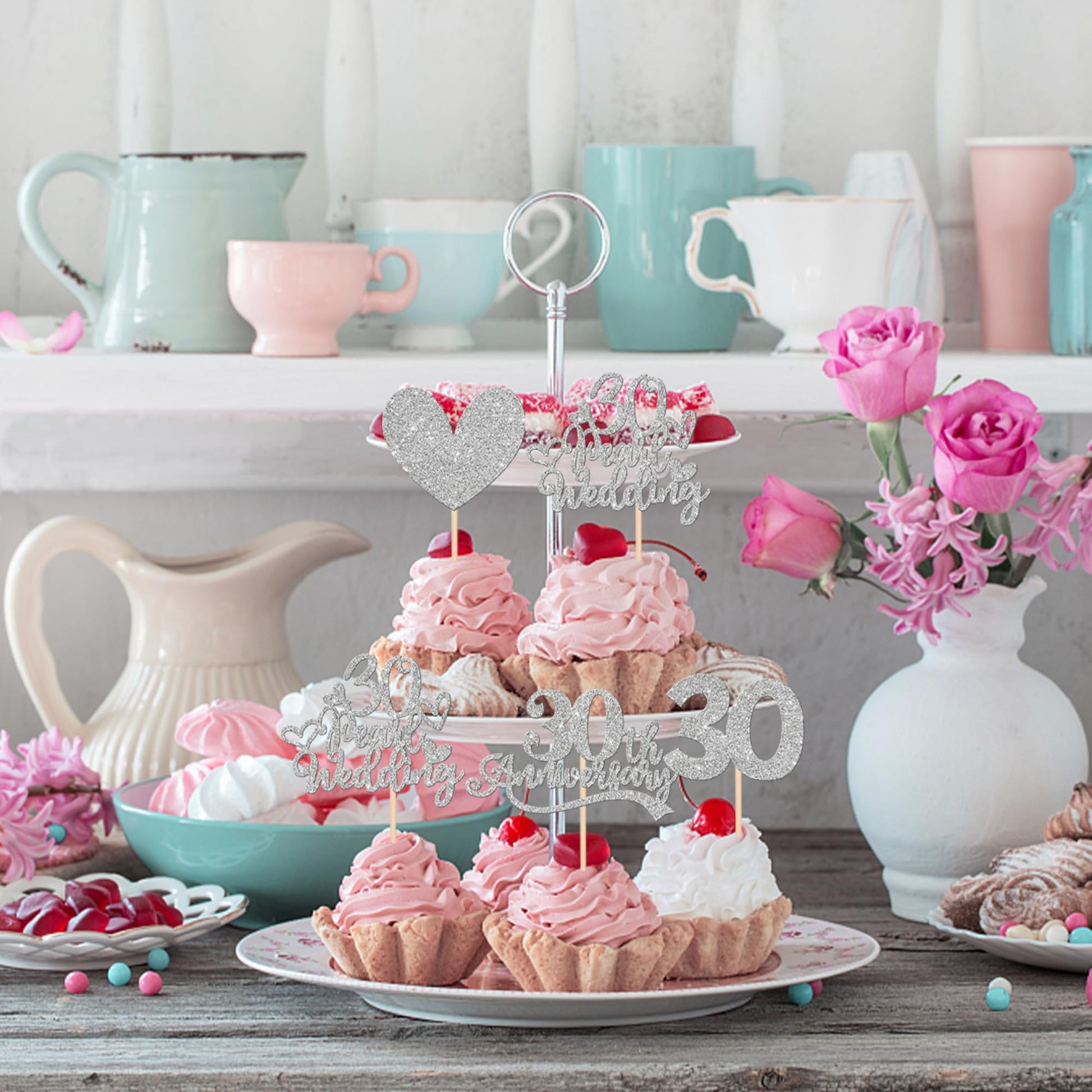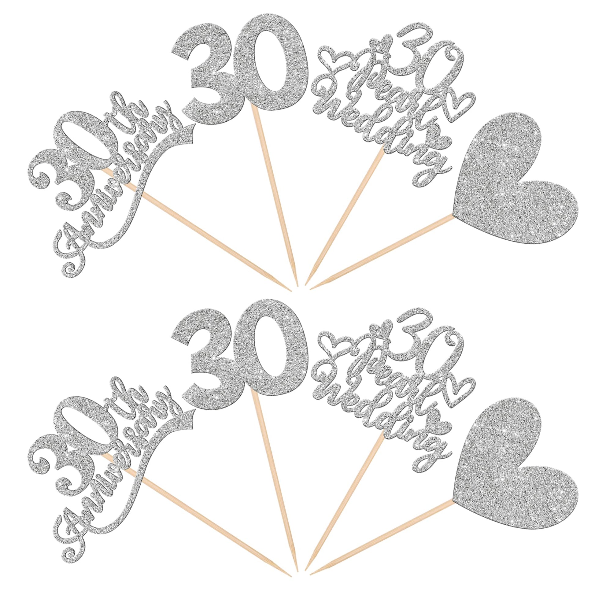 24 Pcs 30Th Anniversary Cupcake Toppers Silver Glitter Heart 30 Pearl Wedding Anniversary Cupcake Picks For Cheers To 30 Years B