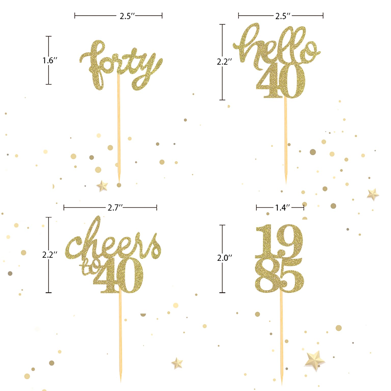 Q: What material are the 40th birthday cupcake toppers made from?A: The 40th birthday cupcake toppers are made of glittery cardboard, which is non-toxic and safe for food. They are durable and sturdy, ensuring they hold up well during your celebration.