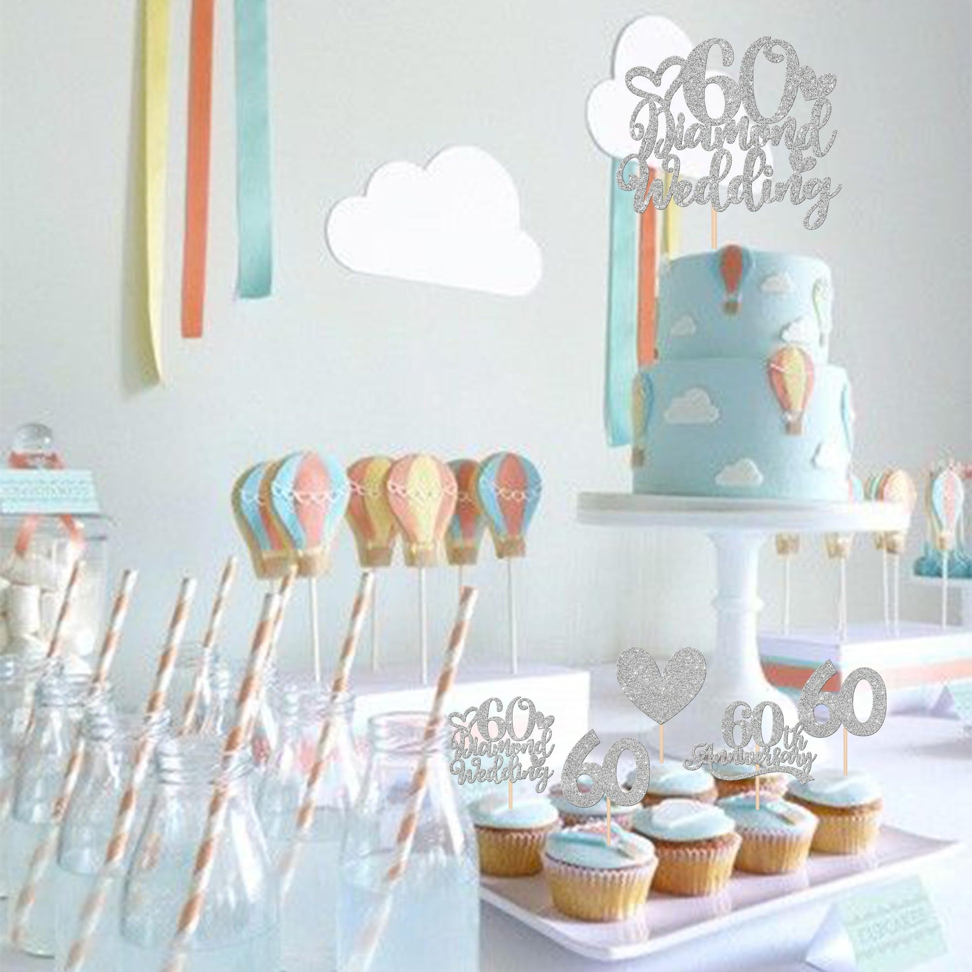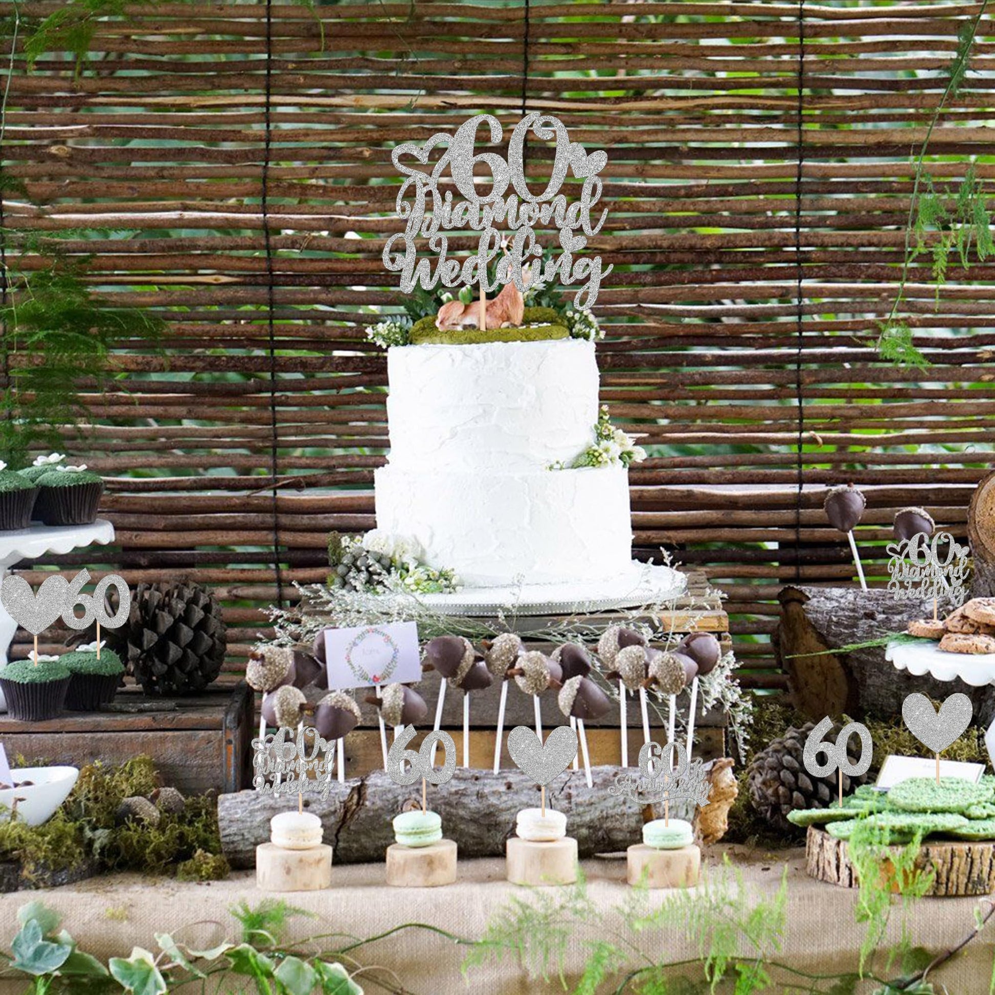 60 Diamond Wedding Anniversary Cake And Cupcake Toppers For Happy 60Th Wedding Anniversary Party Cake Decorations Supplies. Perfect For 60Th Diamond Wedding Theme Party, Happy 60Th Wedding Anniversary Theme Party, 60 Years Blessed & Loved Theme Party, Cheers To 60 Years Anniversary Theme Party Cake Decorations Supplies. Pack Of 25 Pcs, 1 Pcs Cake Topper + 24 Pcs Cupcake Toppers. The Size Is ( With Stick ) Made Of High Quality Paper Card Stock And Food Grade Sticks,Thick And Sturdy. This Cake Topper Is One Side Glitter, Another Side Is White, And This Is Intended For Decoration Only, Please Do Not Put Them In Oven Or Microwave. If The Item You Received Has Any Defects, Please Contact Us For Refund.We Will Deal With It Within 24 Hours.