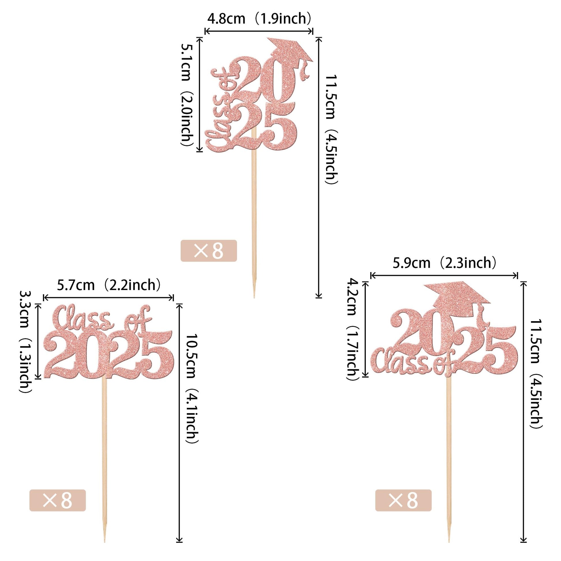 Q: What are the dimensions of the 2025 graduation cap cupcake toppers?A: The cupcake toppers come in three sizes: 1.9 x 4.5 inches, 2.2 x 4.1 inches, and 2.3 x 4.5 inches, including the stick.