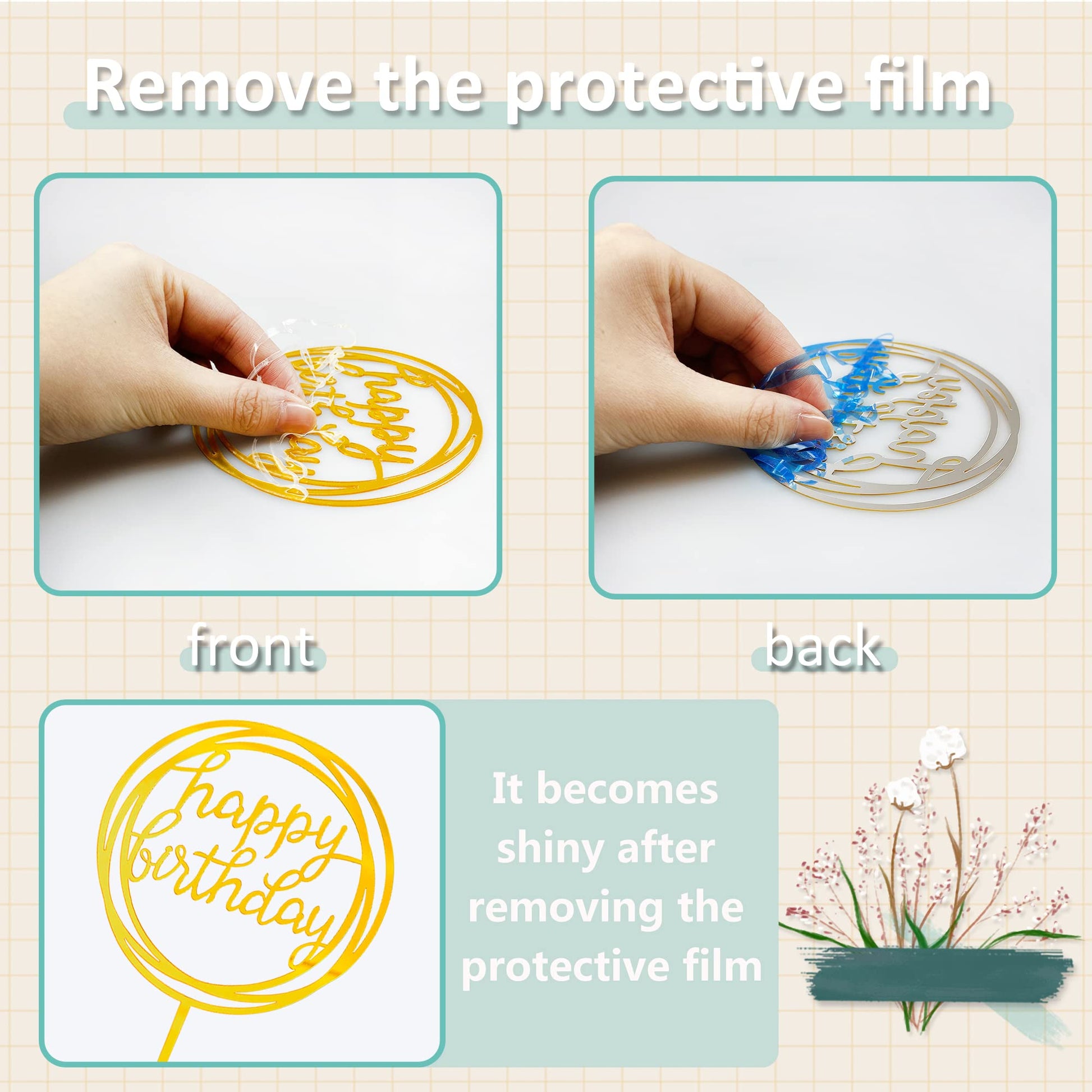 Q: What materials are the cake toppers made from?A: The mini balls cake toppers are made from high-quality plastic, while the happy birthday topper is crafted from acrylic. Together, they provide an elegant and durable decoration for your cakes.