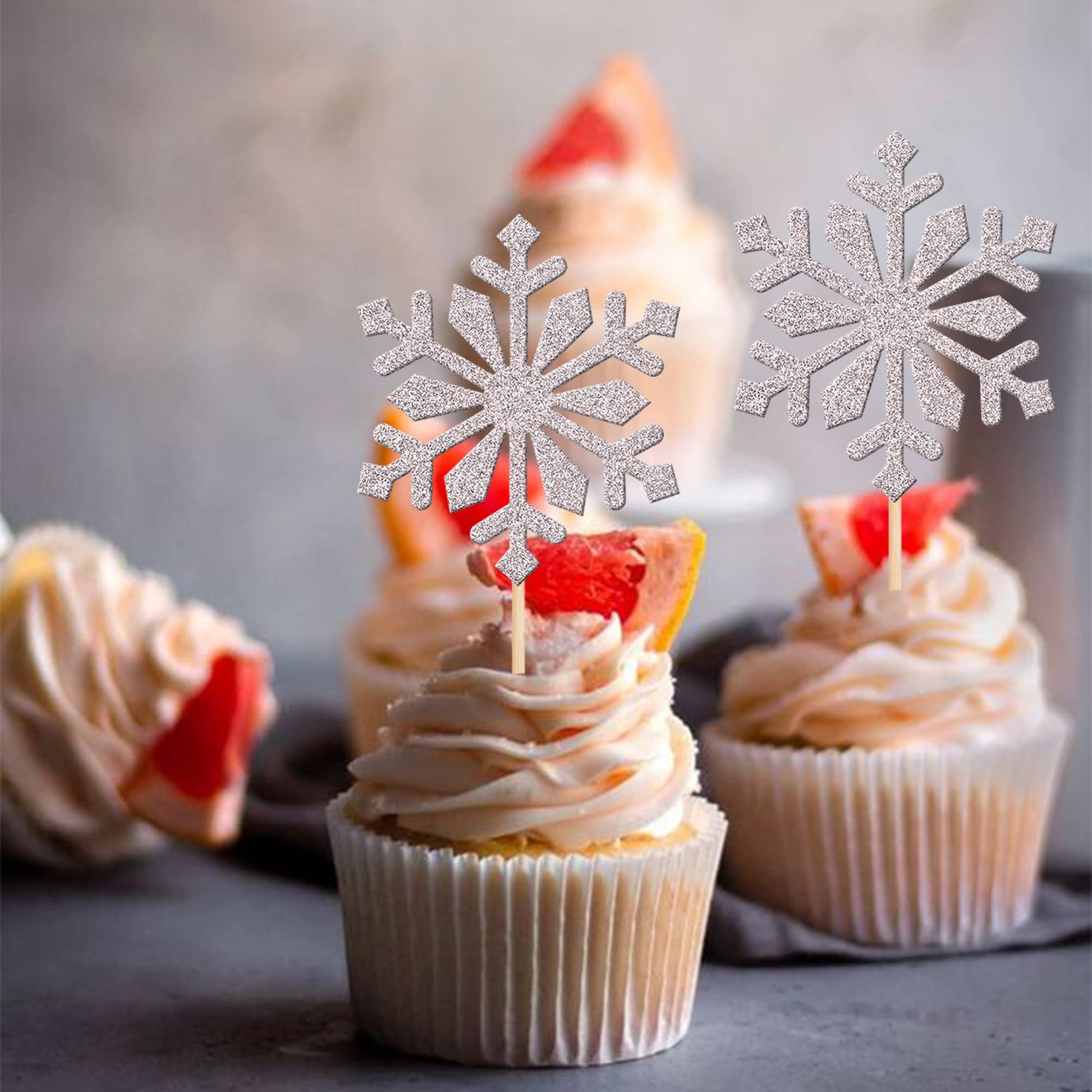 Q: Can I use these cupcake toppers for other desserts besides cupcakes?A: Absolutely! These glitter snowflake toppers can be used for various desserts, including ice cream, fruits, cookies, and other treats, adding a festive touch to any winter-themed celebration.