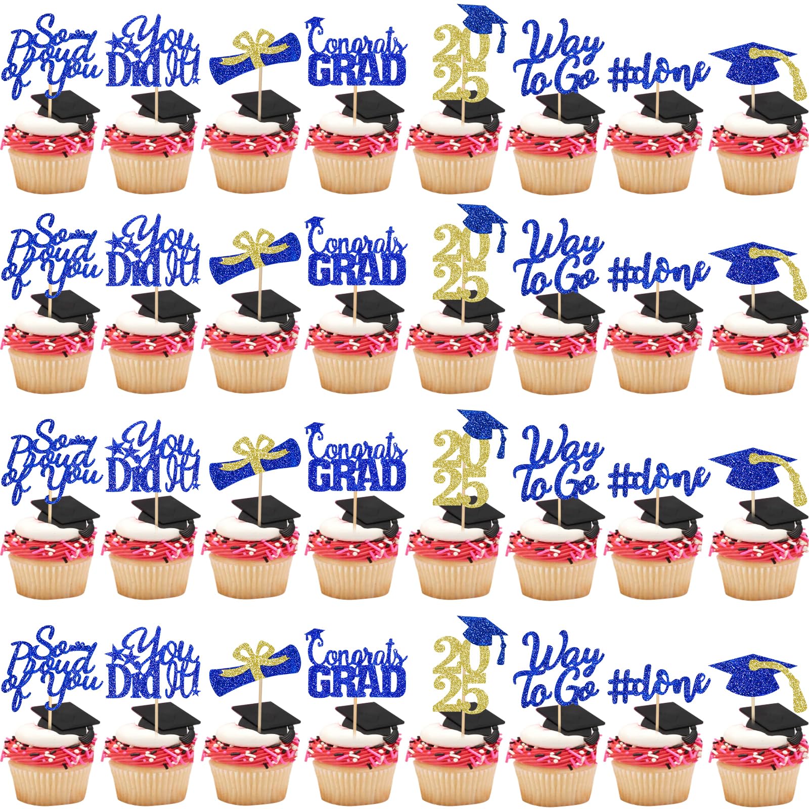 Q: How many different designs are included in the graduation cupcake toppers set?A: The set includes 8 unique designs, each featuring 4 pieces, making a total of 32 cupcake toppers for your graduation party.