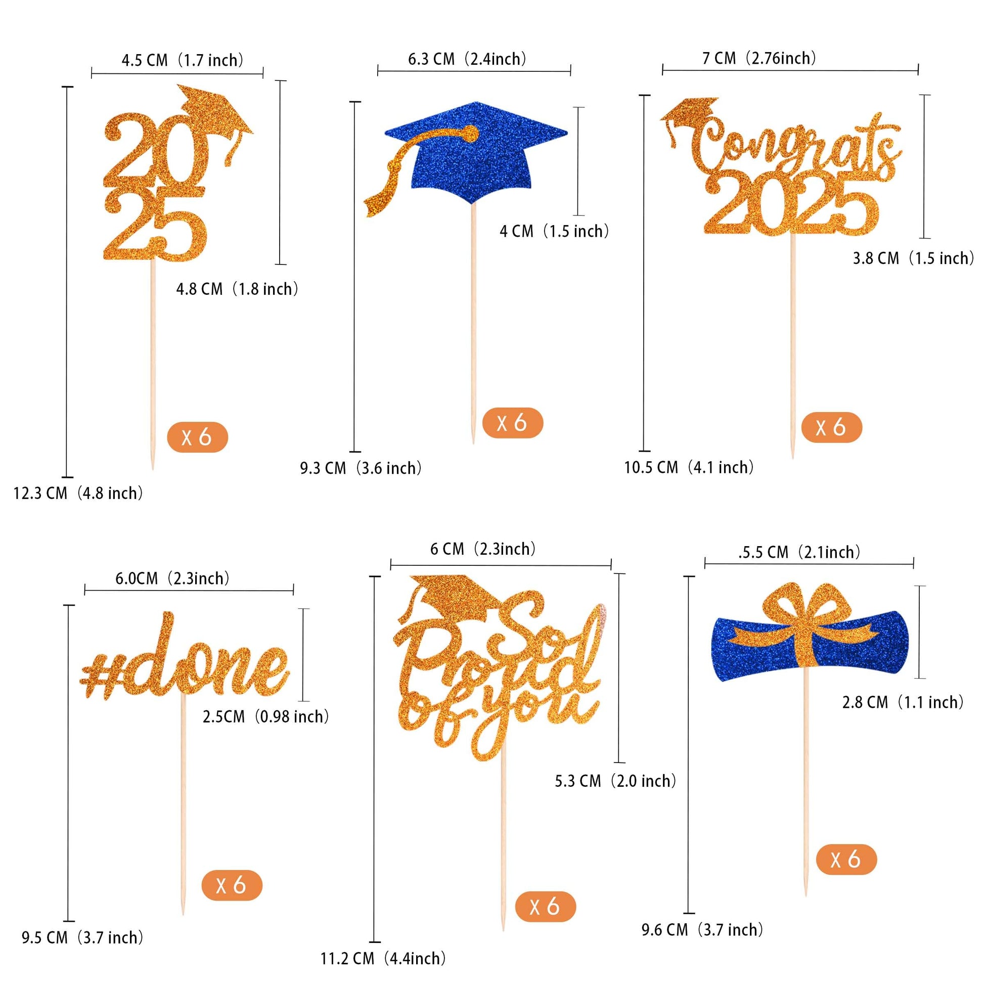 Q: What are the dimensions of the Class of 2025 cupcake toppers?A: The dimensions of the toppers vary: '2025' is 1.8*1.9 inches, the diploma is 2.2*1.1 inches, the cap is 2.5*1.6 inches, 'Congrats 2025' is 2.8*1.5 inches, '#done' is 2.4*0.98 inches, and 'So proud of you' is 2.4*2.1 inches.