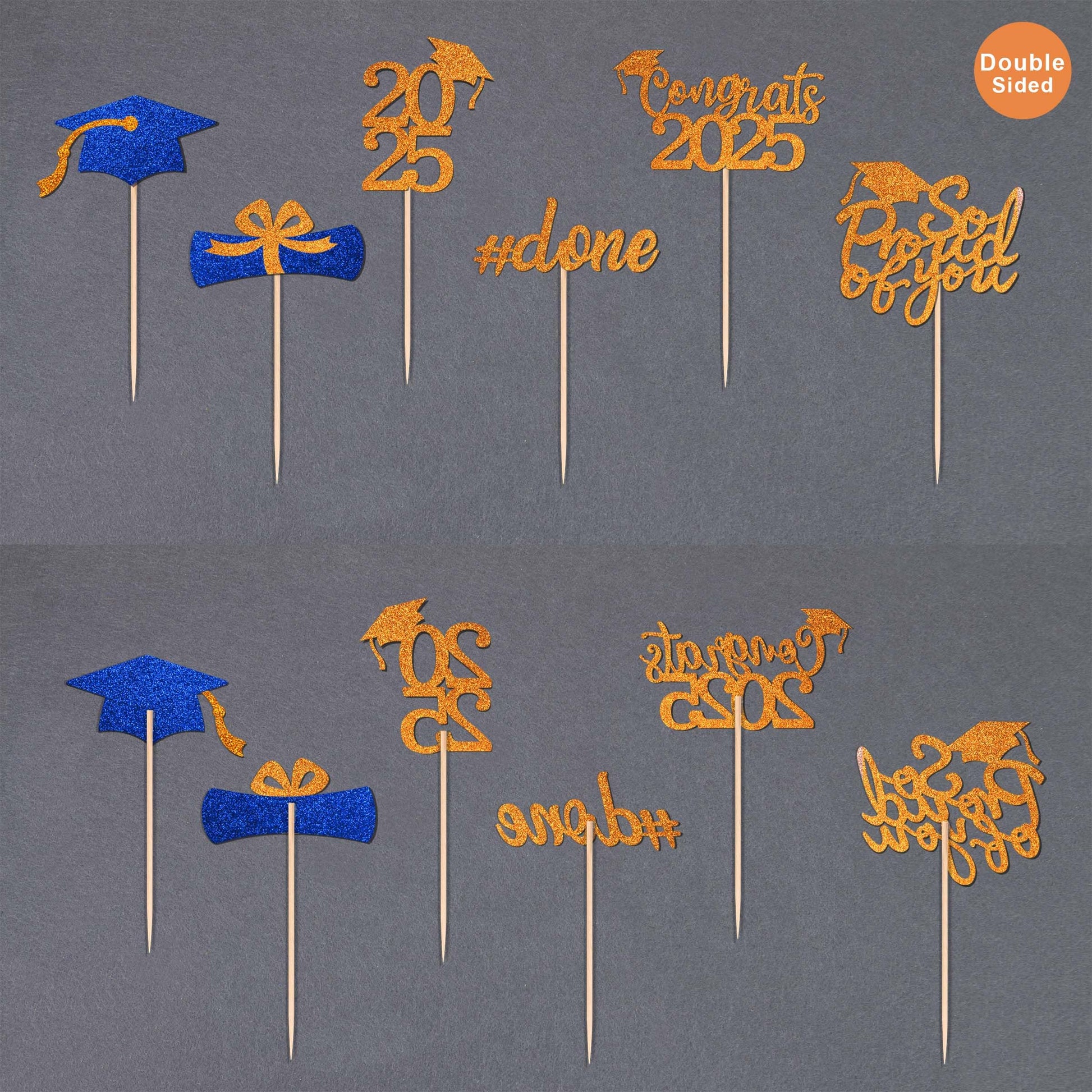 Q: Are the cupcake toppers safe to use with food?A: Yes, these Class of 2025 cupcake toppers are made of high-quality double-sided glitter power card stock and food-grade wooden sticks, making them safe for decorating cakes, cupcakes, fruits, and other delicious foods.