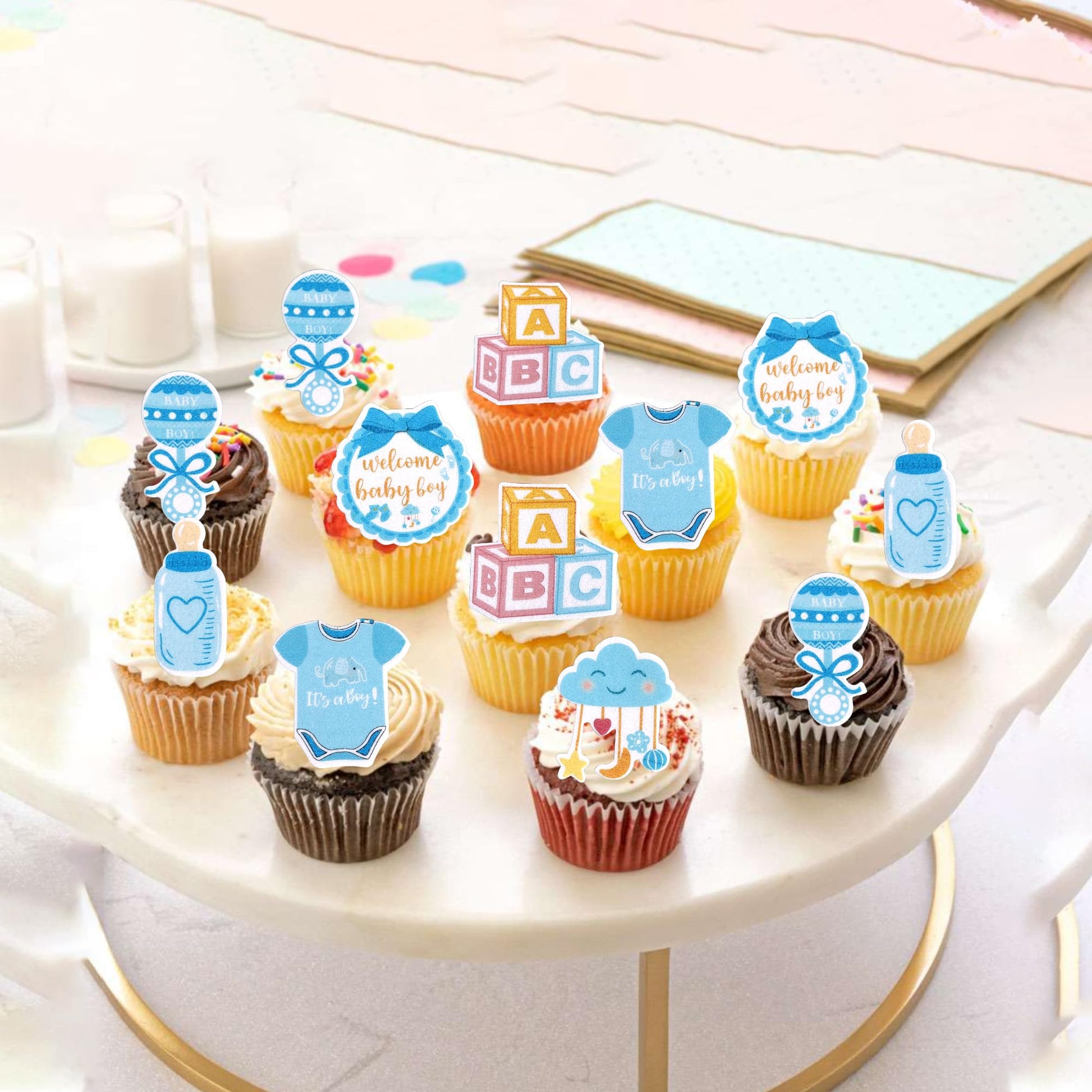 Q: Are these cupcake toppers suitable for a baby shower or gender reveal party?A: Yes, these edible cupcake toppers are perfect for a baby shower, 'it's a boy' theme party, or a gender reveal party. Their unique design will enhance the celebratory atmosphere of your event.
