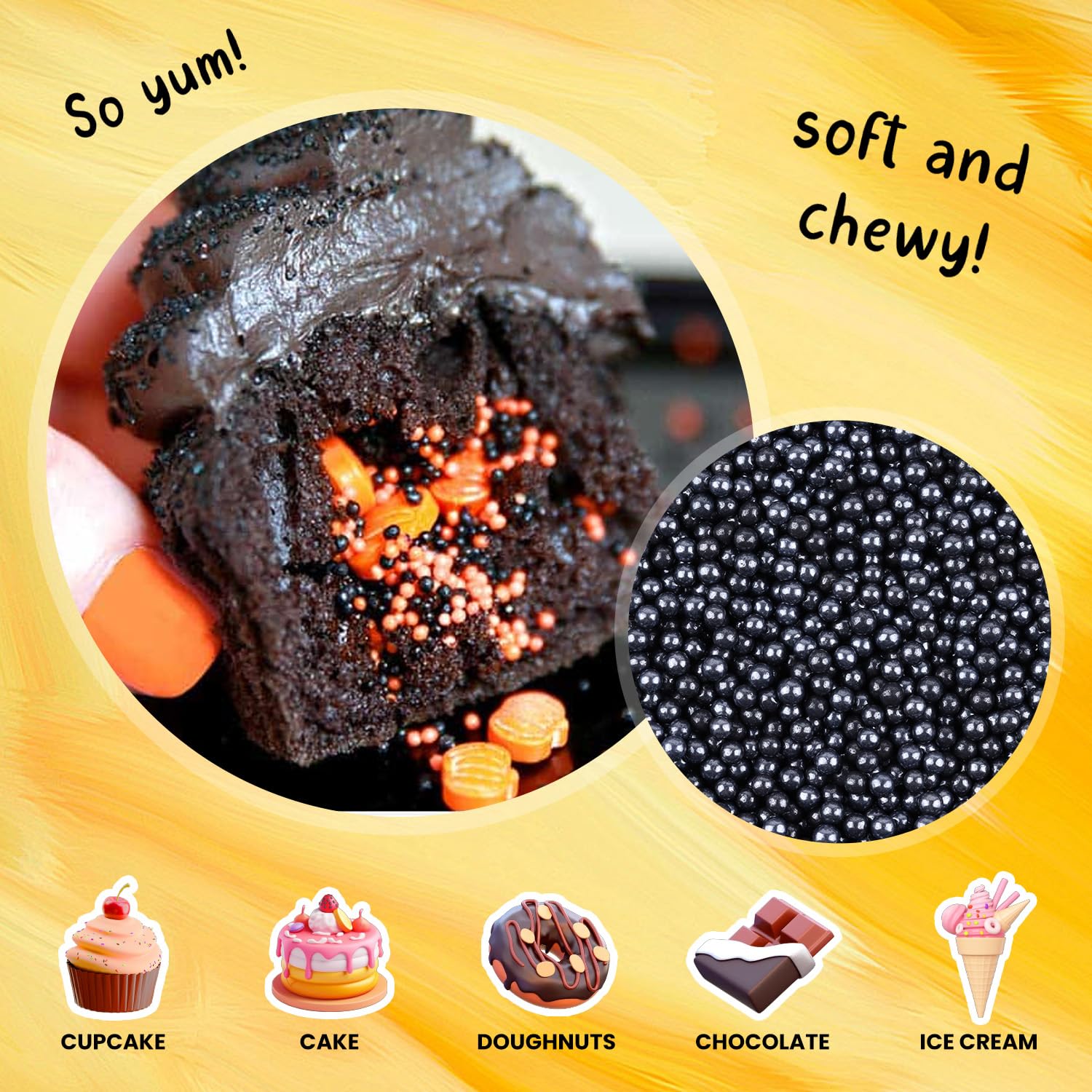 Q: How can I use the black sprinkles for cake decorating?A: You can use the black edible pearls individually or as a mix. They can be sprinkled over frosting, used to accentuate specific designs, or to create a uniform glittering surface on cakes, cookies, cupcakes, and more.
