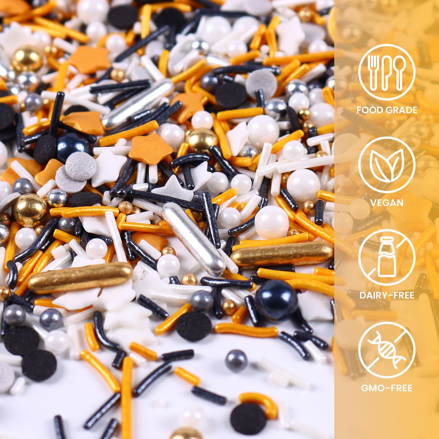 Sujoygar Black Sprinkles Are Non Toxic. Use Gold Sprinkles To Decorate Cakes, Cupcake Or Cookies After Baking To Avoid Melting. Use Raw Materials That Meet Food Safety Standards. In Which Metallic Gold Sprinkles Are Decorative Use Only. Take An Appropriate Amount Of Black Gold Jimmies Sprinkles To Decorate The Cake, Cupcakes, Cookies, Chocolate, Ice Cream, Donuts And Desserts, Etc. Make The Food More Halloween Christmas Wedding Party Birthday Valentines Festive.