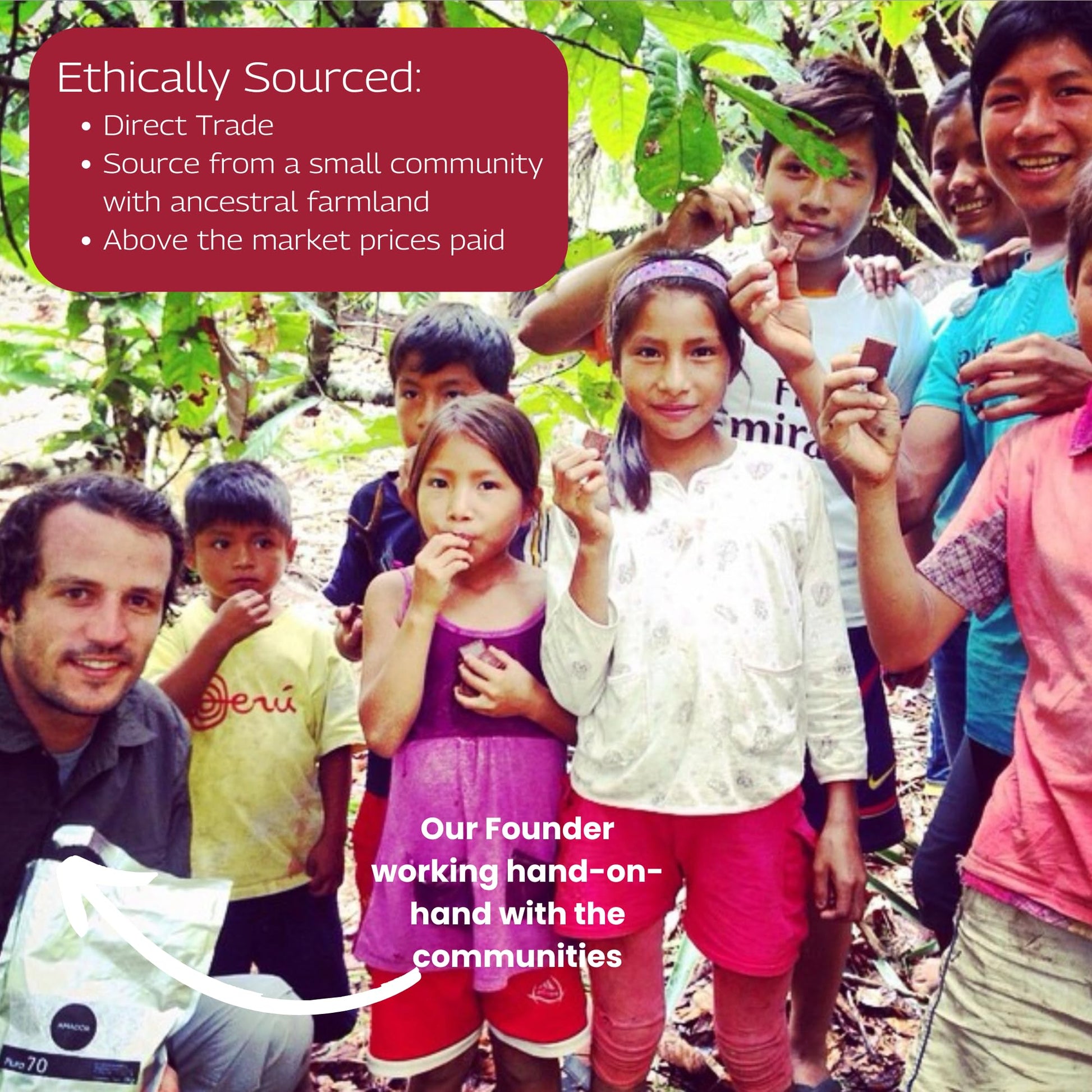 - Q: How is your cacao sourced and what makes it unique? A: Our cacao is sourced directly from traditional farmers in the Morropon province of Peru. We have been collaborating with these farmers for over 10 years, ensuring sustainable growing practices and quality control. The unique growing conditions and the heritage of the cacao trees contribute to the exceptional flavors and quality of our product.
