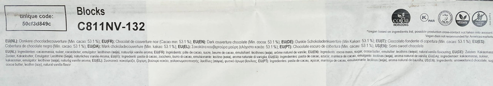 Q: What are the main features of Callebaut C811 Dark Chocolate?A: Callebaut C811 Dark Chocolate is a versatile professional-grade chocolate with a 53.1% cocoa solids content, offering a level 2 thickness fluidity ideal for various culinary applications. It is also vegan, gluten-free, and certified kosher and halal.