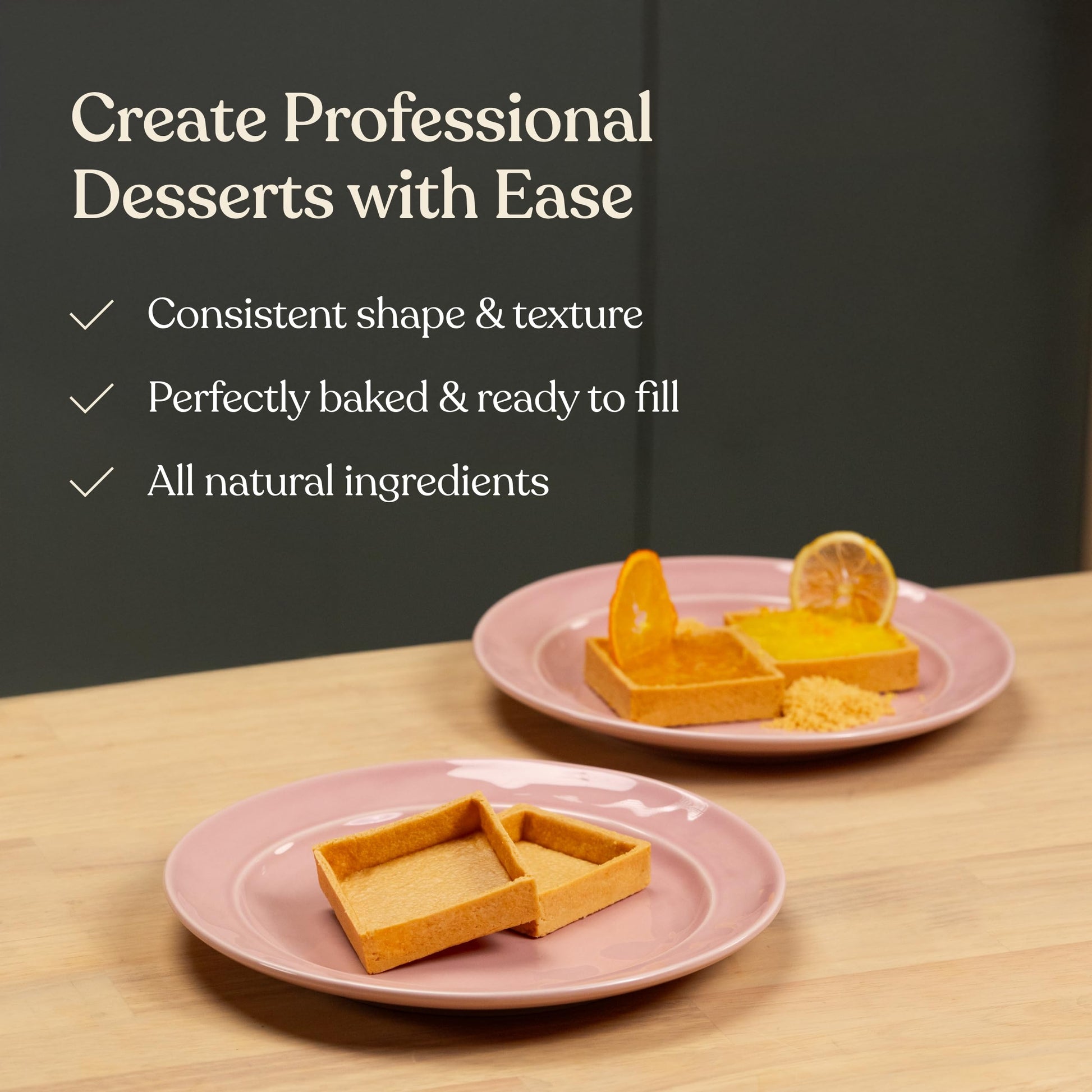 Q: What are Cambie Large Square Vanilla Tart Shells made of?A: Cambie Large Square Vanilla Tart Shells are crafted using high-quality ingredients to create a buttery sweet, crisp shell. They are coated with a thin layer of white chocolate couverture that helps prevent sogginess and maintains their shape.